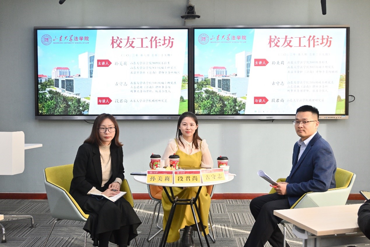 12月16日,法學(xué)院校友工作坊第29期在華崗苑舉行。本期校友工作坊邀請到了法學(xué)院2009級本科生、2013級碩士研究生、現(xiàn)就職于北京金杜(濟(jì)南)律師事務(wù)所的孫美莉校友,2016級碩士研究生、現(xiàn)就職于山東德衡(濟(jì)南)律師事務(wù)所的古守志校友,法學(xué)院段君尚助理研究員擔(dān)任與談人。