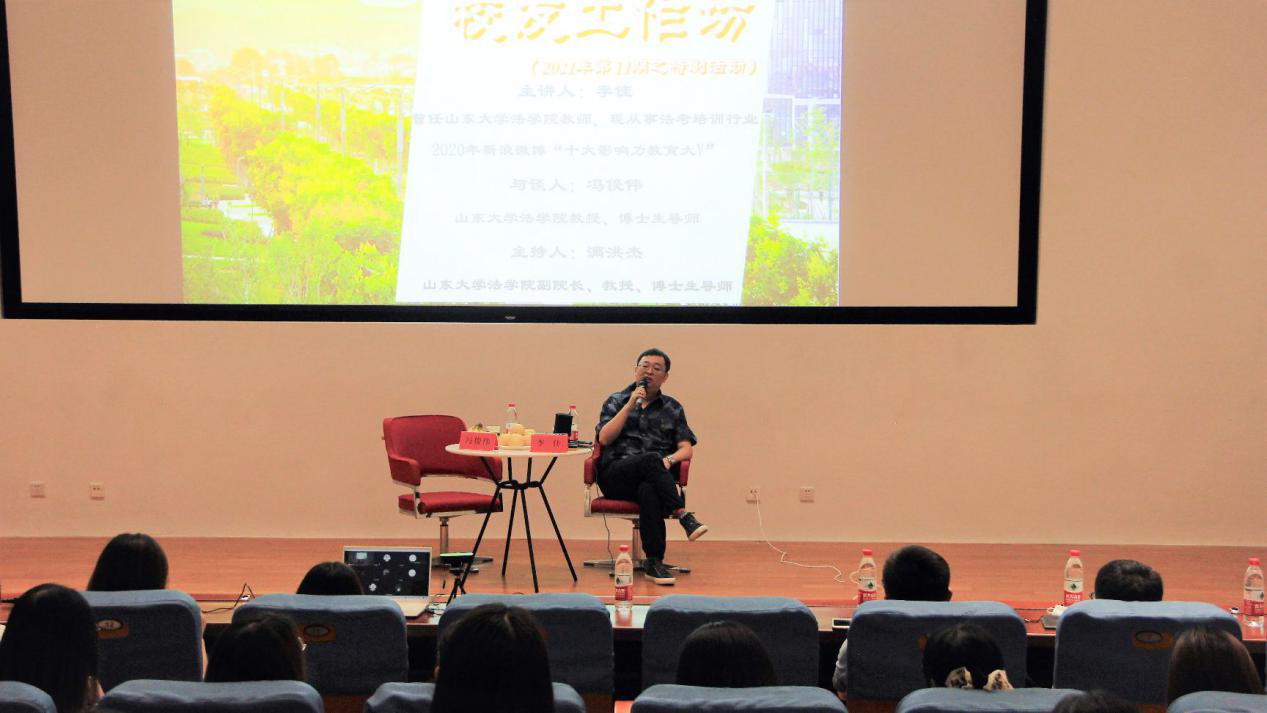 6月22日,法學(xué)院校友工作坊2021年第十一期(特別活動(dòng))邀請(qǐng)到曾在山東大學(xué)法學(xué)院任教、2020年新浪微博“十大影響力教育大V”李佳老師。李佳老師圍繞“法考人的別樣人生”這一主題就自己的人生經(jīng)歷與所獲心得體會(huì)展開(kāi)精彩分享,法學(xué)院副院長(zhǎng)滿(mǎn)洪杰教授主持活動(dòng),馮俊偉教授擔(dān)任與談人,法學(xué)院黨委副書(shū)記鄒永厚與200余名同學(xué)參加了活動(dòng)。