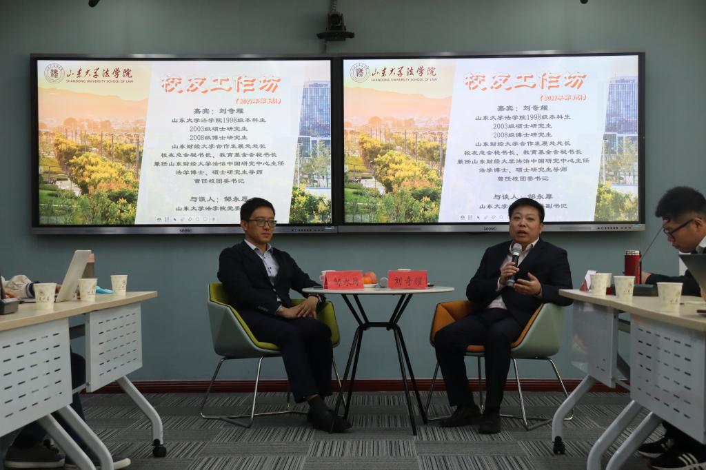 4月18日,法學(xué)院校友工作坊2021年第5期邀請到山東大學(xué)法學(xué)院1998級本科生、2003級碩士研究生、2008級博士研究生,山東財經(jīng)大學(xué)合作發(fā)展處處長、校友工作辦公室主任劉奇耀。劉奇耀校友以“法科學(xué)生的學(xué)業(yè)態(tài)度和職業(yè)選擇”為題向同學(xué)們分享了個人求學(xué)和就業(yè)階段的心路歷程。法學(xué)院黨委副書記鄒永厚作為與談人參加了活動。