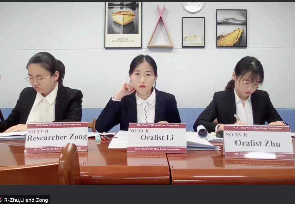 我院代表隊(duì)由向力副教授擔(dān)任教練,參賽隊(duì)員來(lái)自2018級(jí)法學(xué)英語(yǔ)雙學(xué)位班,分別由朱霖徽、李芮瑩、蘇慧、趙文匯擔(dān)任辯手,宗心彤、牟書(shū)欣擔(dān)任研究員。在歷時(shí)兩個(gè)多月的備賽過(guò)程中,向力副教授予以悉心指導(dǎo),各位隊(duì)員齊心協(xié)力,充分利用課余時(shí)間深入研究WTO協(xié)定條文和大量相關(guān)案例,完成了近2萬(wàn)字的起訴方和被訴方英文書(shū)狀,先后進(jìn)行了10余場(chǎng)口辯演練和庭審?fù)蒲荨Mㄟ^(guò)此項(xiàng)賽事的備賽和場(chǎng)上比賽,參賽隊(duì)員顯著提升了法律英語(yǔ)口語(yǔ)水平和英文法律文書(shū)寫(xiě)作能力,同時(shí)深化了對(duì)WTO規(guī)則和WTO爭(zhēng)端解決機(jī)制的理解和運(yùn)用。