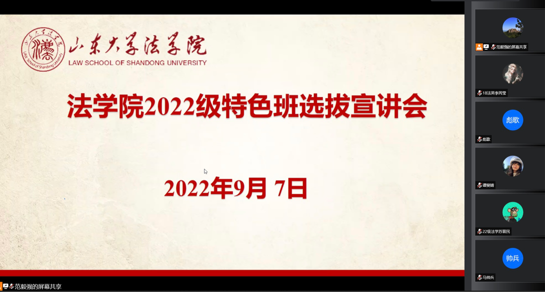 為增進(jìn)2022級新生對法學(xué)院涉外法治人才特色班的了解,學(xué)院于9月7日在線上召開2022級特色班選拔宣講會。法學(xué)院副院長馮俊偉教授,李長勇副教授,劉俊霞副教授和劉楠楠老師出席會議,教務(wù)秘書范毅強(qiáng)主持會議。2019級中日經(jīng)貿(mào)法律班閻瀅潔、白若涵同學(xué)、2018級法學(xué)與英語雙學(xué)位班李芮瑩同學(xué)作了經(jīng)驗交流。