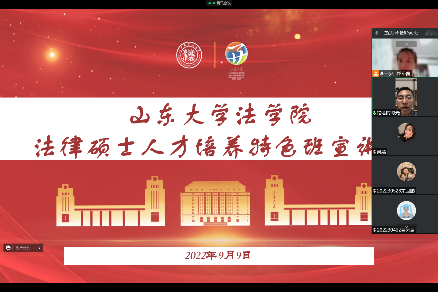 9月9日晚,山東大學(xué)法學(xué)院法律碩士人才培養(yǎng)特色班宣講會如期舉行。宣講會先后由知識產(chǎn)權(quán)法研究所所長崔立紅,國際法研究所所長黃世席主講,法學(xué)院研究生辦公室研究生秘書張曉敏主持,副院長馮俊偉出席本次宣講會。2020級知識產(chǎn)權(quán)人才培養(yǎng)特色班學(xué)生代表王偉、2021級涉外人才培養(yǎng)特色班代表何婕在會上作了經(jīng)驗(yàn)交流。