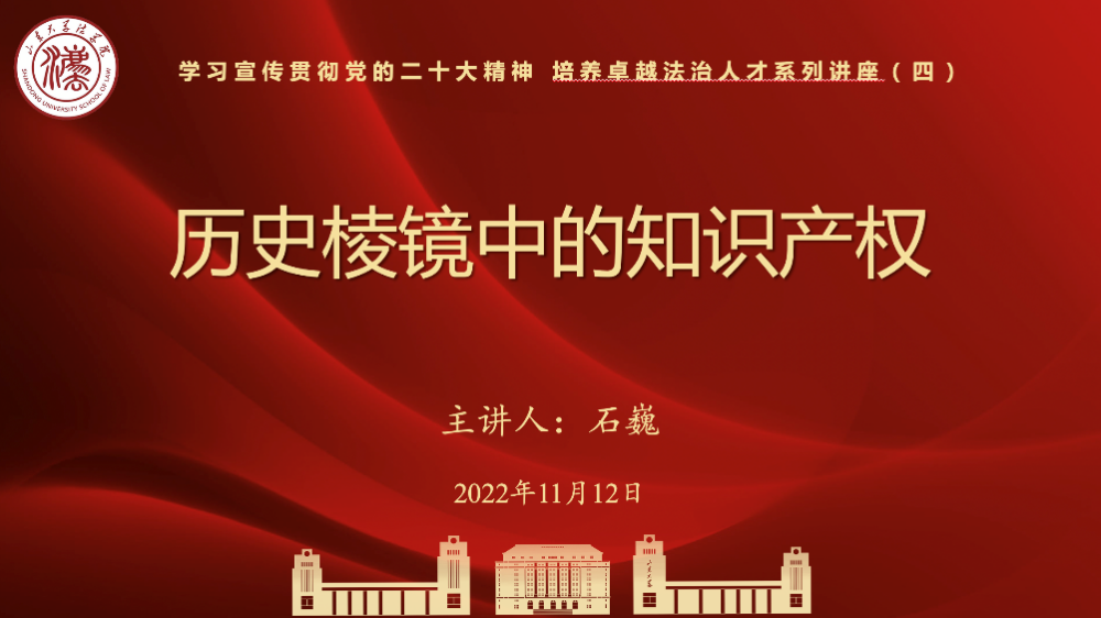 11月12日晚,山東大學(xué)法學(xué)院“學(xué)習(xí)宣傳貫徹黨的二十大精神,培養(yǎng)卓越法治人才”系列講座第四期于華崗苑北樓順利舉辦。國家特聘專家、山東大學(xué)法學(xué)院教授石巍以“歷史棱鏡中的知識產(chǎn)權(quán)”為題做了一場精彩紛呈的講座。本次講座由法學(xué)院碩士研究生才源主持,二百余名師生參會。