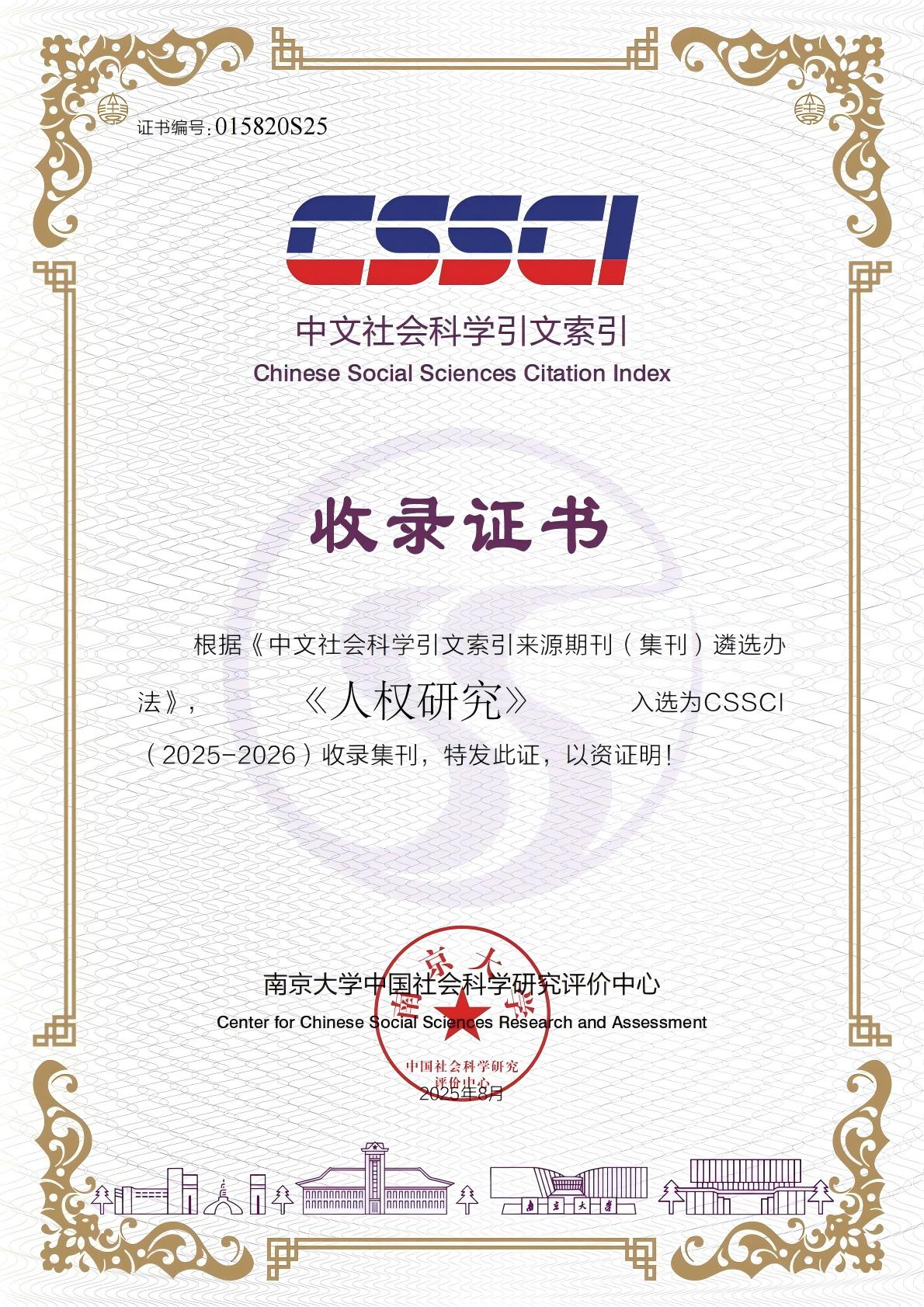 2025年8月,南京大學(xué)中國社會科學(xué)研究評價中心發(fā)布消息,山東大學(xué)人權(quán)研究中心主辦的《人權(quán)研究》入選為CSSCI(2025-2026)收錄集刊。目前,《人權(quán)研究》已連續(xù)多次入選CSSCI收錄集刊。