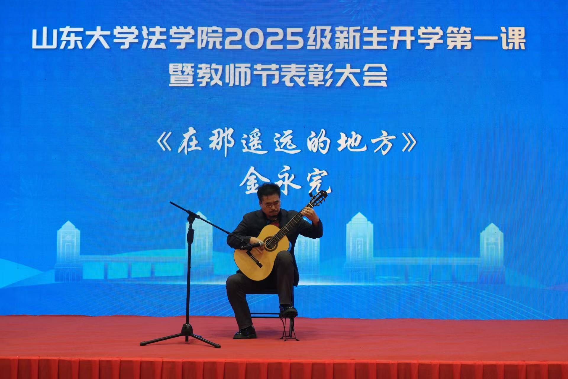 大會(huì)播放了《你好,新法律人》迎新紀(jì)錄短片,法學(xué)院教師代表金永完教授現(xiàn)場演奏古典吉他樂曲,展現(xiàn)學(xué)院教師風(fēng)采,為新生們帶來獨(dú)特的美育教育第一課。