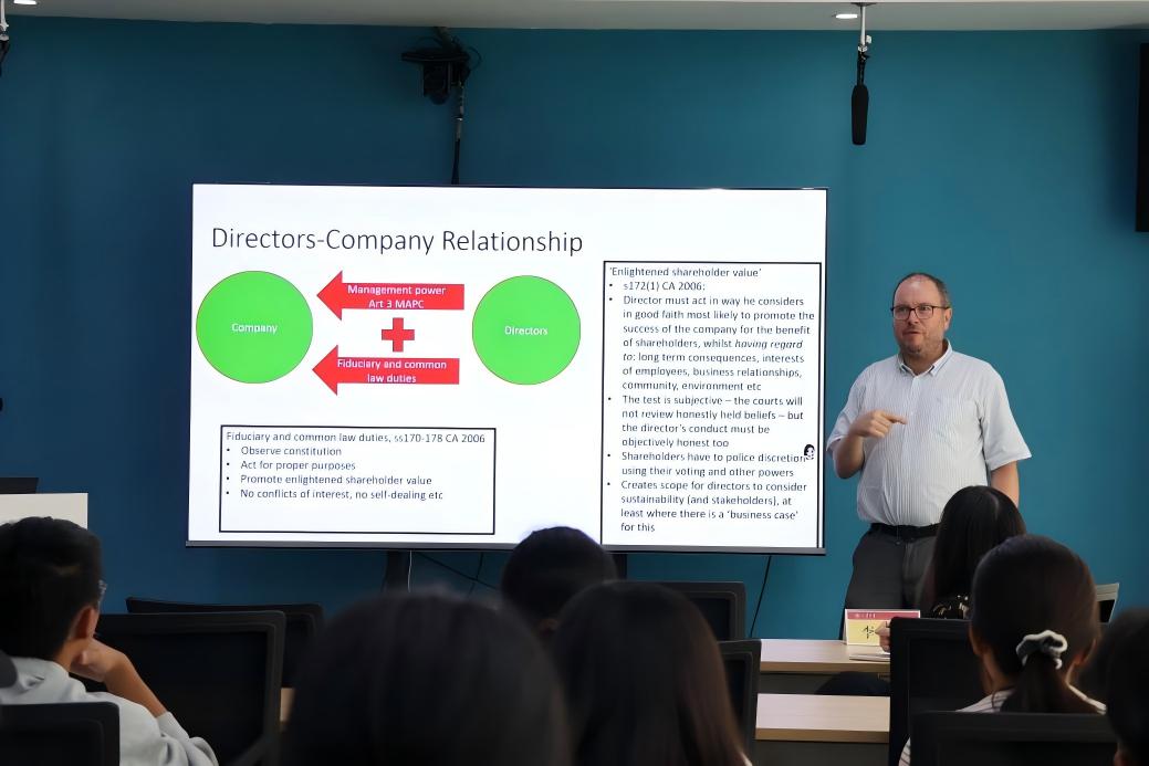 講座伊始,Andrew Johnston教授從公司治理的基礎(chǔ)框架出發(fā),系統(tǒng)闡釋了英國公司法律體系中股東與公司、董事與公司的內(nèi)部關(guān)系,以及“開明股東價值原則”的法律內(nèi)涵,指出當(dāng)代英國公司治理從股東價值至上向兼顧可持續(xù)發(fā)展的演進(jìn)趨勢。隨后,他從披露標(biāo)準(zhǔn)、跨國監(jiān)管影響等維度深入剖析了英國在推進(jìn)公司可持續(xù)治理中面臨的問題:披露標(biāo)準(zhǔn)層面,對比指出英國“單一重要性”與歐盟“雙重重要性”在可持續(xù)發(fā)展報告披露標(biāo)準(zhǔn)上的差異;跨國監(jiān)管層面,分析指出脫歐后英國企業(yè)仍受歐盟CSRD、CSDDD等監(jiān)管規(guī)則影響的現(xiàn)實(shí)困境。最后,他聚焦探析問題根源,從完善披露規(guī)則、強(qiáng)化機(jī)構(gòu)投資者責(zé)任、銜接跨國監(jiān)管標(biāo)準(zhǔn)等方面提出了針對英國公司治理與可持續(xù)發(fā)展融合的系統(tǒng)性建議。