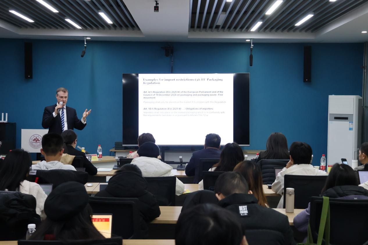 Schroeter深入探討了《聯(lián)合國國際貨物銷售合同公約》及《國際商事合同通則》框架下因行政措施導(dǎo)致供應(yīng)鏈中斷的賠償責(zé)任問題。首先,他將此類行政措施劃分為貨物安全法規(guī)、進(jìn)口限制以及備受關(guān)注的經(jīng)濟(jì)制裁三類。隨后,結(jié)合具體案例,針對這三類措施在性質(zhì)、內(nèi)容及影響上的差異,對法律選擇與法律結(jié)果等關(guān)鍵問題展開了詳細(xì)分析。在與談環(huán)節(jié),張志、張蓓蓓、王天蔚、遲德強(qiáng)、高雅琦等專家先后就講座內(nèi)容發(fā)表了各自的觀點(diǎn)與見解。在提問環(huán)節(jié),Schroeter教授對同學(xué)們提出的問題進(jìn)行了細(xì)致深入的回應(yīng)。