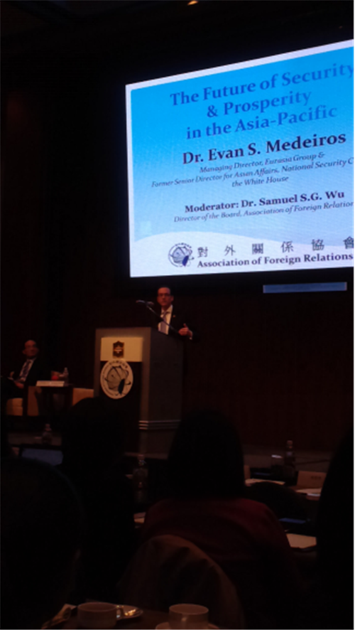 2015年12月17日,我院戴宗翰副教授應(yīng)邀赴臺(tái)北出席“亞太安全與繁榮之未來(lái)”(The Future of Security & Prosperity in the Asia-Pacific)演講會(huì),此次演講會(huì)由臺(tái)灣地區(qū) “對(duì)外關(guān)系協(xié)會(huì)” 主辦,邀請(qǐng)前美國(guó)國(guó)安會(huì)亞洲事務(wù)資深主任麥艾文(Evan S. Medeiros)以英文發(fā)表演說(shuō)。