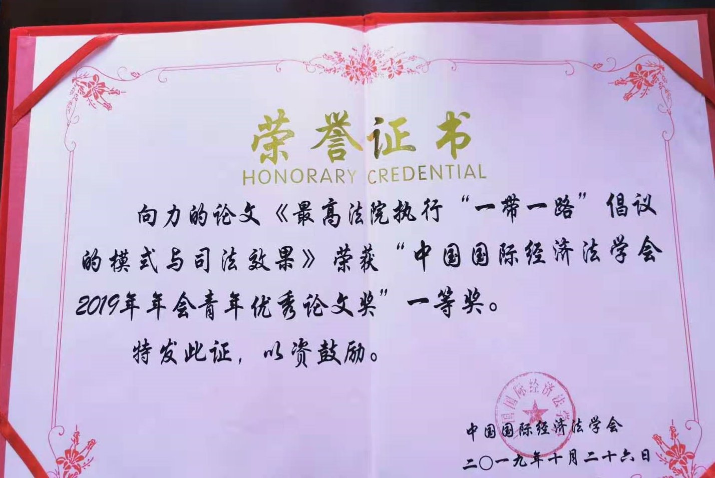 向力博士撰寫的論文《最高法院執(zhí)行“一帶一路”倡議的模式與司法效果》獲得“中國國際經(jīng)濟(jì)法學(xué)會2019年年會青年優(yōu)秀論文獎”一等獎。