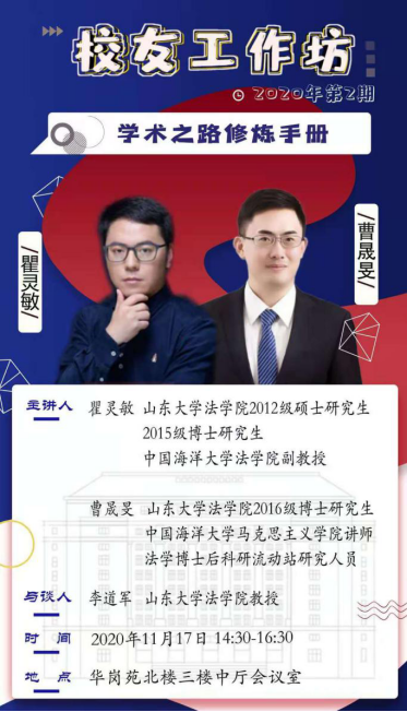 11月17日,法學(xué)院校友工作坊2020年第二期在青島校區(qū)舉行。本期工作坊邀請到法學(xué)院2012級碩士研究生、2015級博士研究生瞿靈敏和2016級博士研究生(碩博連讀)曹晟旻兩位校友,他們以“學(xué)術(shù)之路修煉手冊”為題分享了各自的心路歷程。李道軍教授作為與談人參與分享會。