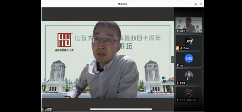 12月9日,山東大學(xué)法學(xué)學(xué)科復(fù)辦四十周年認(rèn)罪認(rèn)罰從寬制度系列論壇第七期于線上舉辦。本期講座由上海交通大學(xué)凱原法學(xué)院林喜芬教授作為主講人,青島大學(xué)法學(xué)院牛傳勇副教授、天津大學(xué)法學(xué)院孫皓副教授、安徽大學(xué)法學(xué)院講師孔令勇作為與談人,法學(xué)院助理研究員趙恒作為主持人。