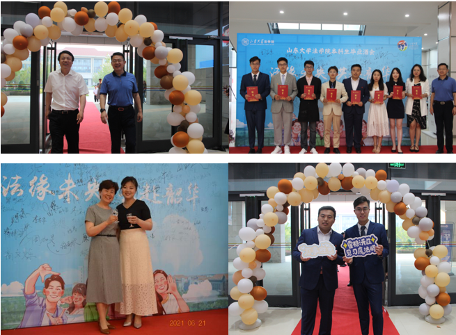 6月21日晚,法學院2021屆本科生畢業(yè)酒會在青島校區(qū)會文南樓舉行。法學院黨委書記于向明、院長周長軍、黨委副書記董雪梅出席活動,2021屆全體本科畢業(yè)生盛裝出席。畢業(yè)酒會由團委副書記、畢業(yè)生輔導員曲儀主持,畢業(yè)生相約踏上紅毯,結伴步入會場,在簽名墻簽名并合影留念。畢業(yè)生臉上洋溢著歡樂與喜悅,也表達了對學院、老師和同學們的不舍。周長軍代表學院為畢業(yè)生送上寄語與祝福,于向明為班級校友理事頒發(fā)聘書。
