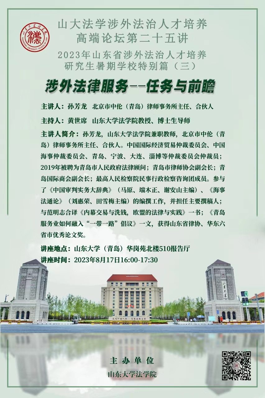 講座預(yù)告 | 山大法學(xué)涉外法治人才培養(yǎng)高端論壇第二十五講:涉外法律服務(wù)——任務(wù)與前瞻