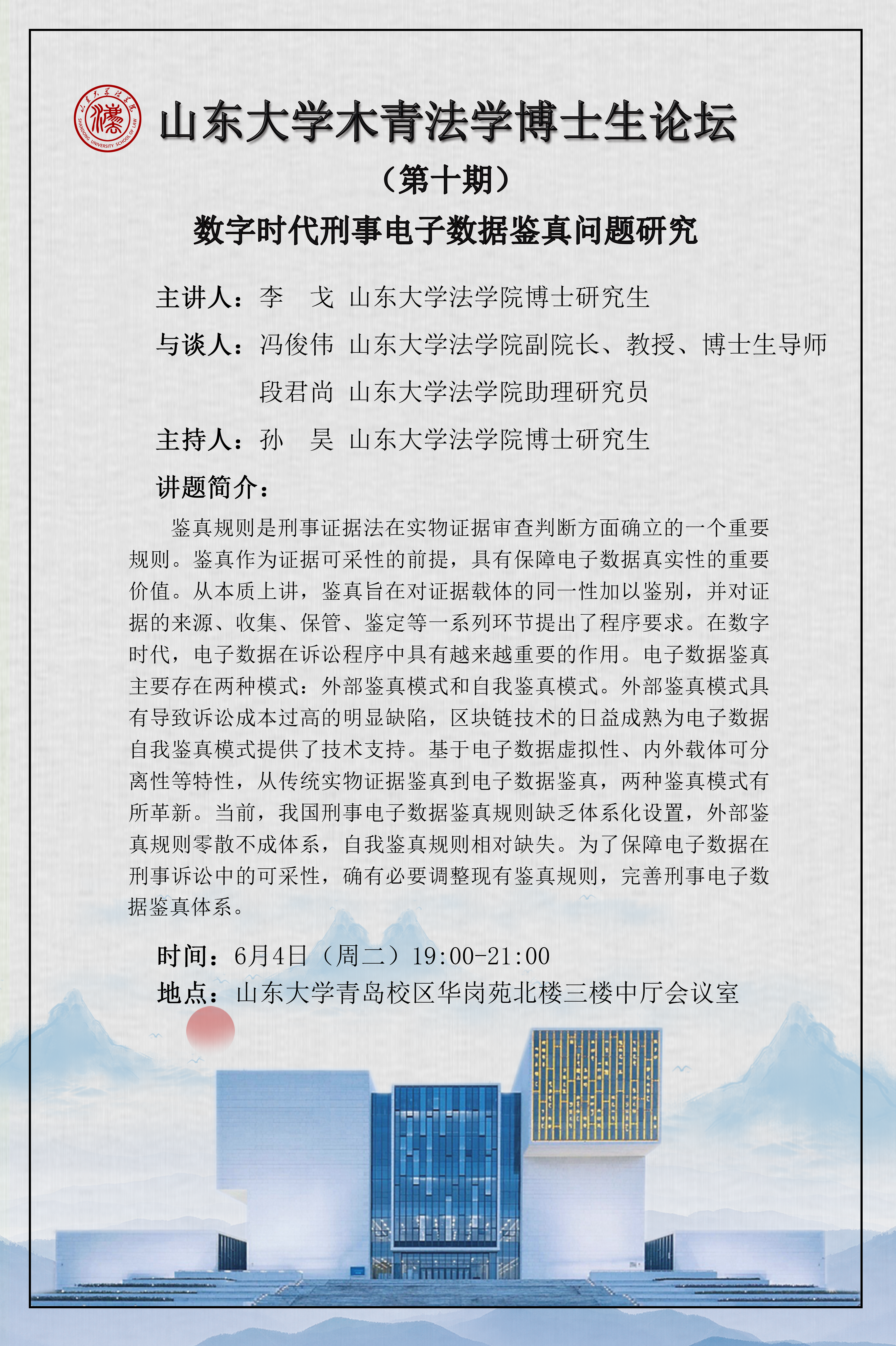 講座預(yù)告 | 山東大學(xué)木青法學(xué)博士生論壇(第十期):數(shù)字時(shí)代刑事電子數(shù)據(jù)鑒真問題研究