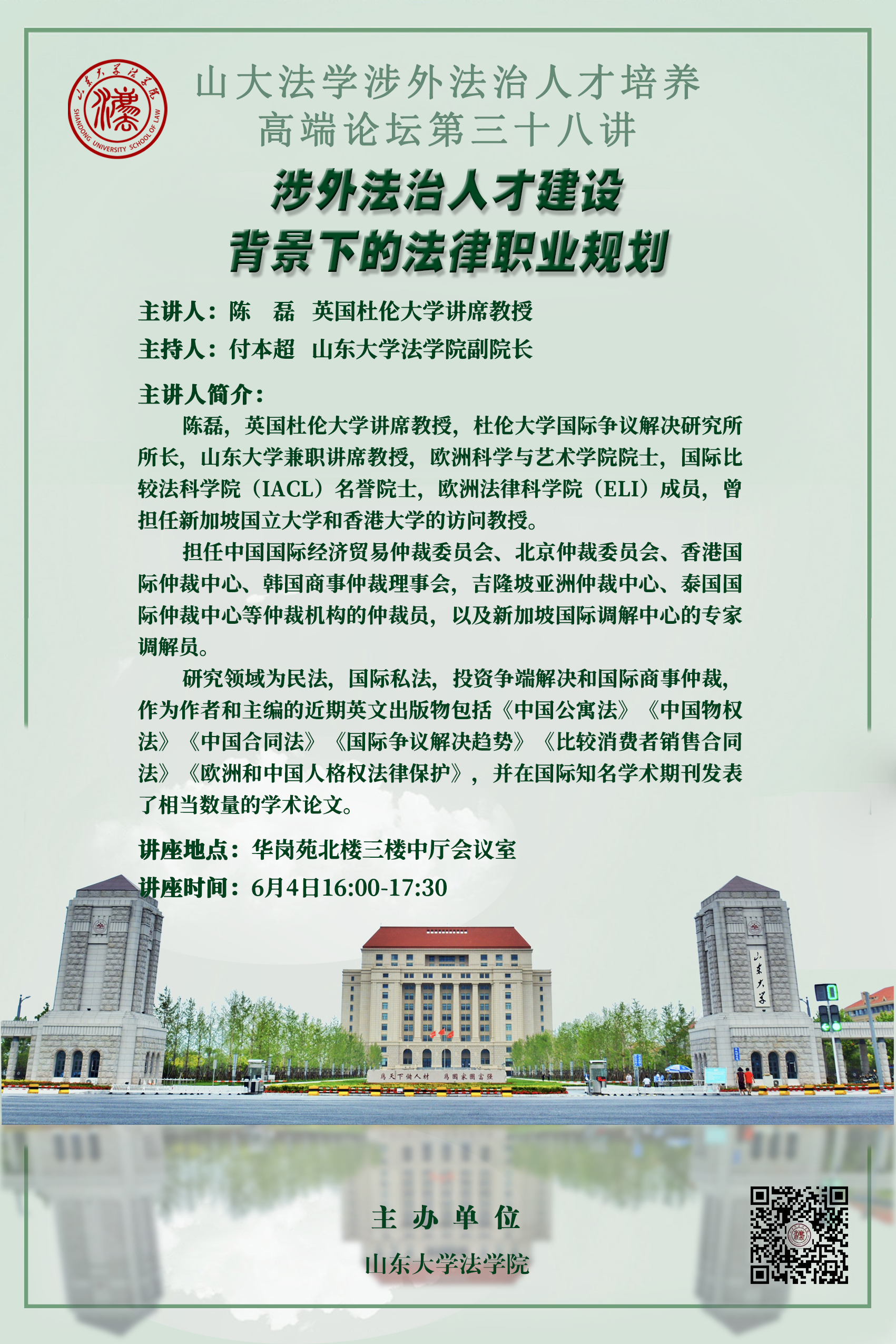 講座預(yù)告 | 山大法學(xué)涉外法治人才培養(yǎng)高端論壇第三十八講:涉外法治人才建設(shè)背景下的法律職業(yè)規(guī)劃