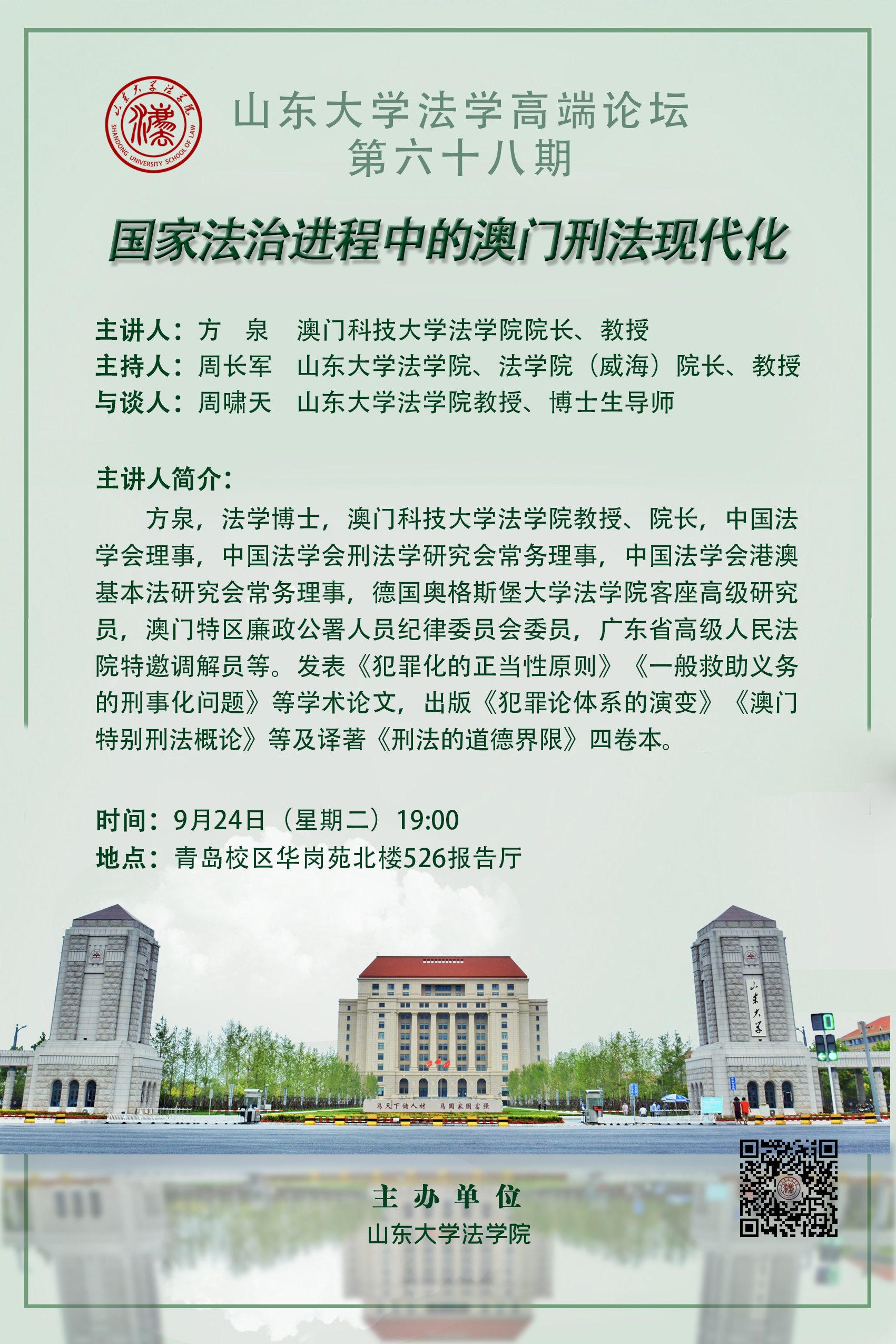 講座預(yù)告 | 山東大學(xué)法學(xué)高端論壇第六十八期:國家法治進程中的澳門刑法現(xiàn)代化