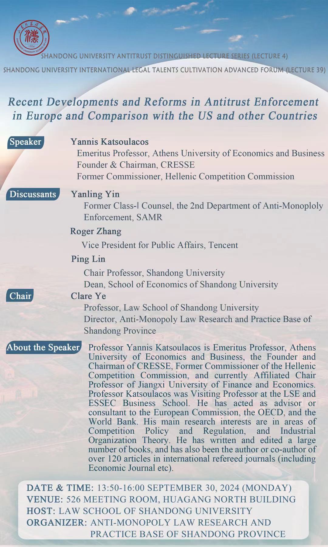 講座預告|山東大學“反壟斷名家系列講壇”第四講:歐洲反壟斷執(zhí)法的最新發(fā)展與變革及其域外比較