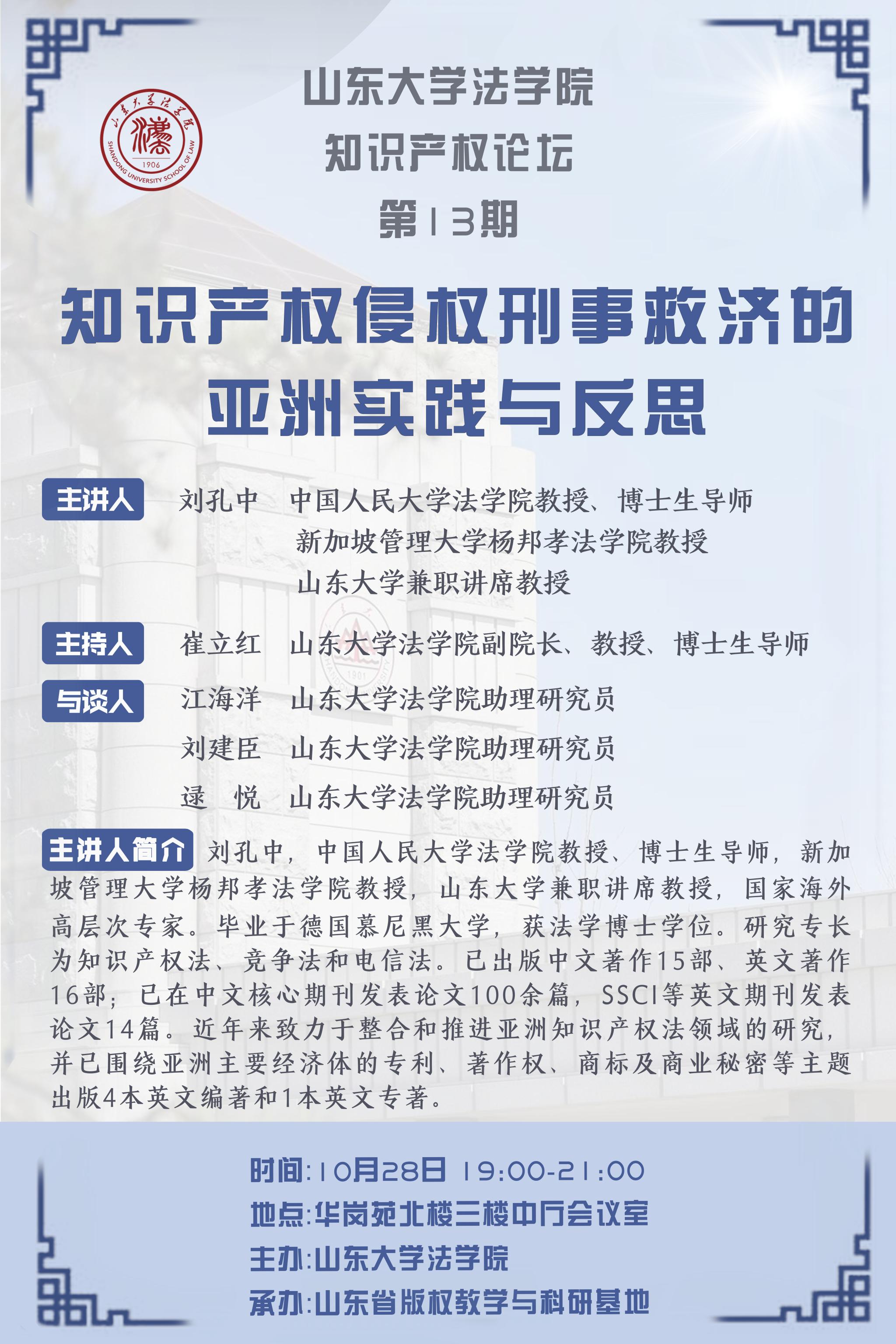 講座預(yù)告|山東大學(xué)法學(xué)院知識產(chǎn)權(quán)論壇第13期:知識產(chǎn)權(quán)侵權(quán)刑事救濟的亞洲實踐與反思