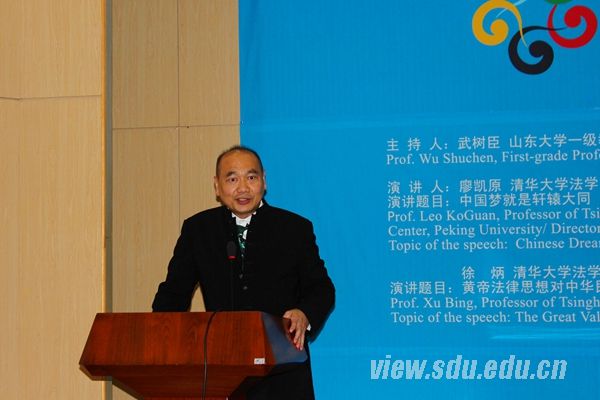 5月20日下午,第三屆尼山世界文明論壇系列講座與會(huì)學(xué)部講座(第二場(chǎng))在法學(xué)院逸夫法學(xué)樓喬偉報(bào)告廳舉行,清華大學(xué)法學(xué)院教授、清華大學(xué)凱原中國(guó)法治與義理研究中心主任、北京大學(xué)凱原法治與義理研究中心主任、上海交通大學(xué)凱原法學(xué)院國(guó)際法治與義理研究中心主任廖凱原教授、清華大學(xué)法學(xué)院教授、清華大學(xué)凱原中國(guó)法治與義理研究中心執(zhí)行主任徐炳教授受邀為山大師生奉獻(xiàn)了一場(chǎng)精彩的演講,講座由山大人文社科一級(jí)教授武樹(shù)臣教授主持。 講座開(kāi)始前,武樹(shù)臣教授對(duì)廖凱原教授進(jìn)行了高度評(píng)價(jià),他稱廖凱原為成功的企業(yè)家、慷慨的慈善家以及極具個(gè)性的學(xué)者。廖凱原教授回顧歷史,高度肯定了軒轅黃帝的偉大的歷史功績(jī)。他總結(jié)中國(guó)夢(mèng)為“根據(jù)每個(gè)人的夢(mèng)想和愿望,以其為始,以其為終”,表示我們前所未有地接近中國(guó)夢(mèng)這一夢(mèng)想。廖凱原教授對(duì)中國(guó)法治及義理的發(fā)展和在現(xiàn)代社會(huì)中的運(yùn)用方面進(jìn)行了詳解,認(rèn)為中國(guó)五千年的持續(xù)文明擁有來(lái)自于軒轅之“道”獨(dú)特的科學(xué)觀法治及義理之治。他歸納了軒轅文化的三個(gè)特點(diǎn),并闡述了一種嶄新的生存范式人生而自由,有無(wú)往不在而自由地生活,擺脫枷鎖,我們終將自由!最后,廖凱原教授在優(yōu)美的長(zhǎng)笛伴奏聲中抑揚(yáng)頓挫的朗誦了詩(shī)歌《軒轅之大同》,深深的震撼了同學(xué)們的身心。 緊接著,徐炳教授進(jìn)行了題為《黃帝法律思想對(duì)中華民族的重要價(jià)值》的報(bào)告。他認(rèn)為,黃帝思想包含著博大精深的法律思想,主要包含以下方面,首先,黃帝的經(jīng)法中確立了法的精神,為以后法的制定提供了明辨是非的準(zhǔn)則。其次,“道”生法及法律要根據(jù)科學(xué)的原則來(lái)制定,否則法即為惡法。最后,黃帝的法律思想明確了法律的價(jià)值觀,即畏天、敬地、親民,因此我們要研究黃帝思想對(duì)中國(guó)的重要價(jià)值。 在隨后的師生提問(wèn)環(huán)節(jié),大家積極發(fā)言,向廖凱原教授、徐炳教授提出疑惑,兩位教授睿智的思想和獨(dú)到的見(jiàn)解令現(xiàn)場(chǎng)的師生折服。最后武樹(shù)臣教授對(duì)報(bào)告進(jìn)行總結(jié),提出中國(guó)文化博大精深,身為中國(guó)人我們要以此為傲,為軒轅文化傳播發(fā)展做出自己的貢獻(xiàn)。