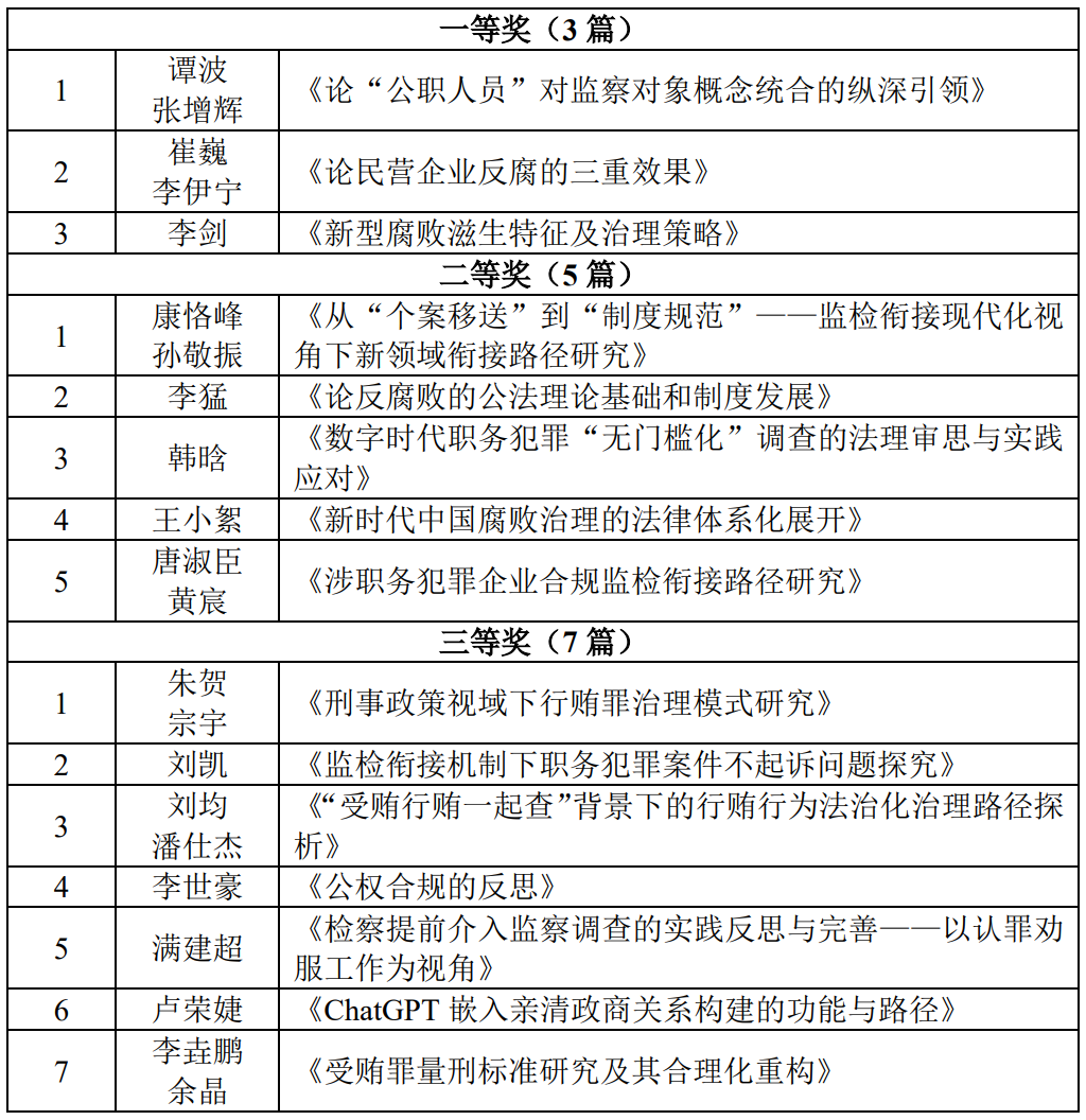 2023年11月,為召開“中國式反腐敗立法的實踐成效與改革前瞻研討會暨山東省法學(xué)會監(jiān)察法學(xué)研究會2023年年會”,主辦方山東大學(xué)法學(xué)院、山東省法學(xué)會監(jiān)察法學(xué)研究會面向全國進行公開征稿。截止11月30日,主辦方共收到來自全國的論文投稿數(shù)十篇。經(jīng)分組匿名初評、匯總復(fù)評及終評環(huán)節(jié)后,共評選出15篇獲獎?wù)撐模渲幸坏泉?篇,二等獎5篇,三等獎7篇。