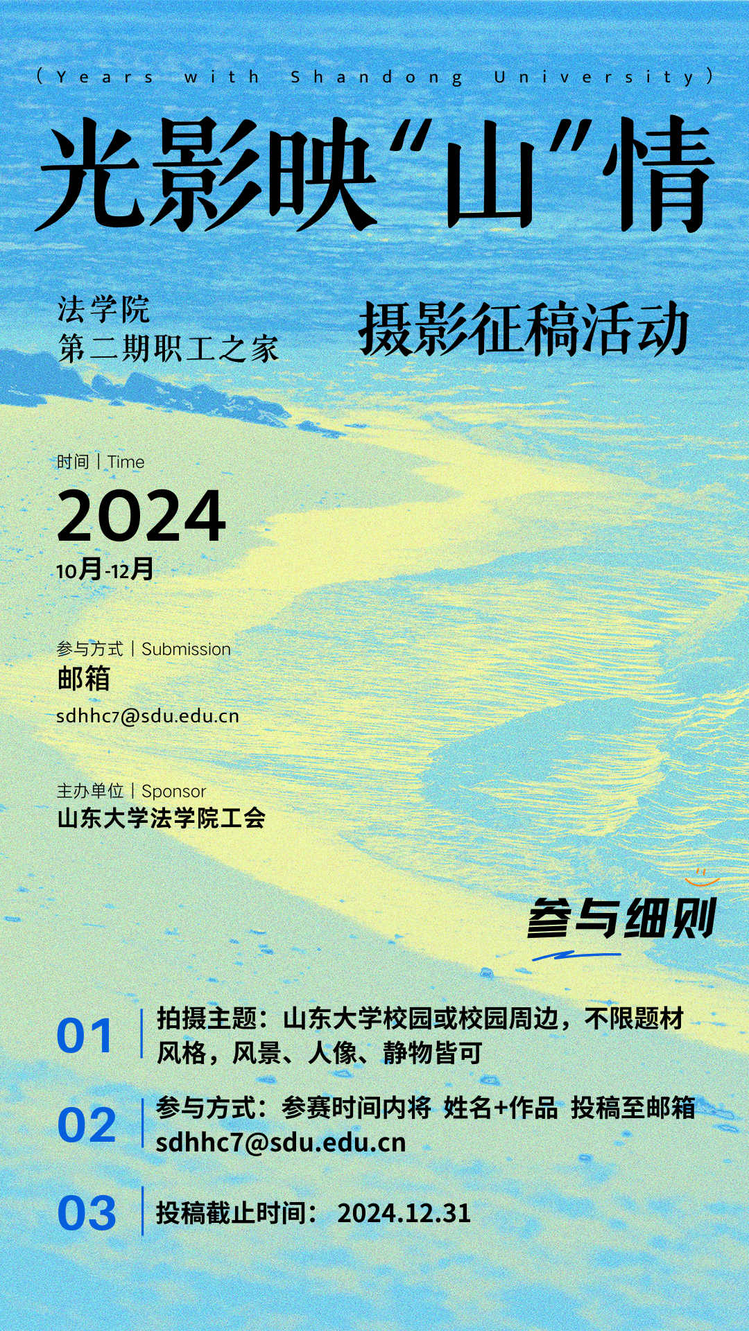 在此我們誠摯的邀請您,參與【第二期職工之家攝影征稿活動】,通過鏡頭里的光影訴說與山大的難忘時刻。(具體參與細(xì)則參見海報)