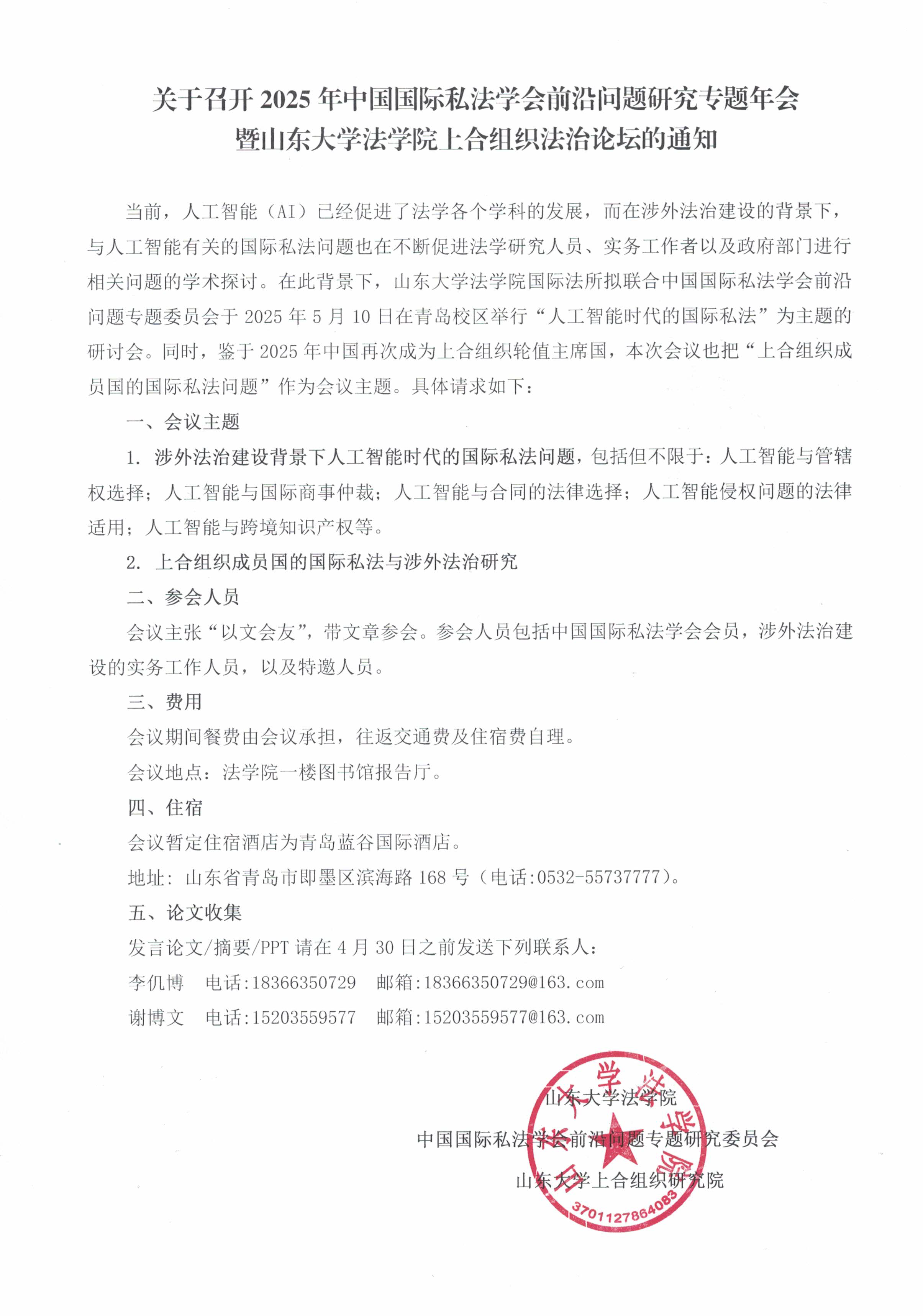 關(guān)于召開2025年中國國際私法學會前沿問題研究專題年會暨山東大學法學院上合組織法治論壇的通知