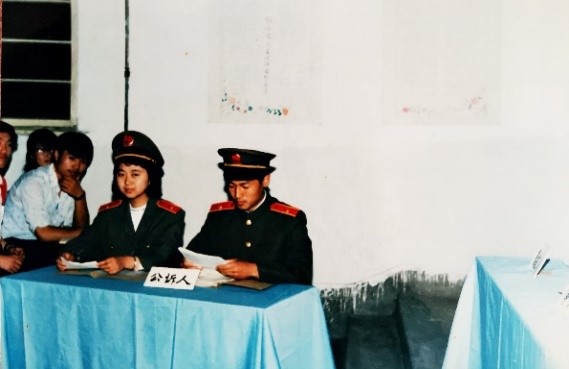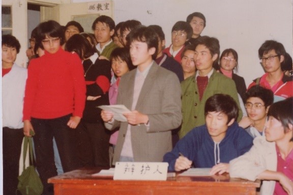◇1992年5月21日,法學(xué)社同學(xué)在4號樓116教室舉辦模擬法庭,八九級經(jīng)濟(jì)法班的畢惠巖、高文儉同學(xué)“出庭”支持公訴。