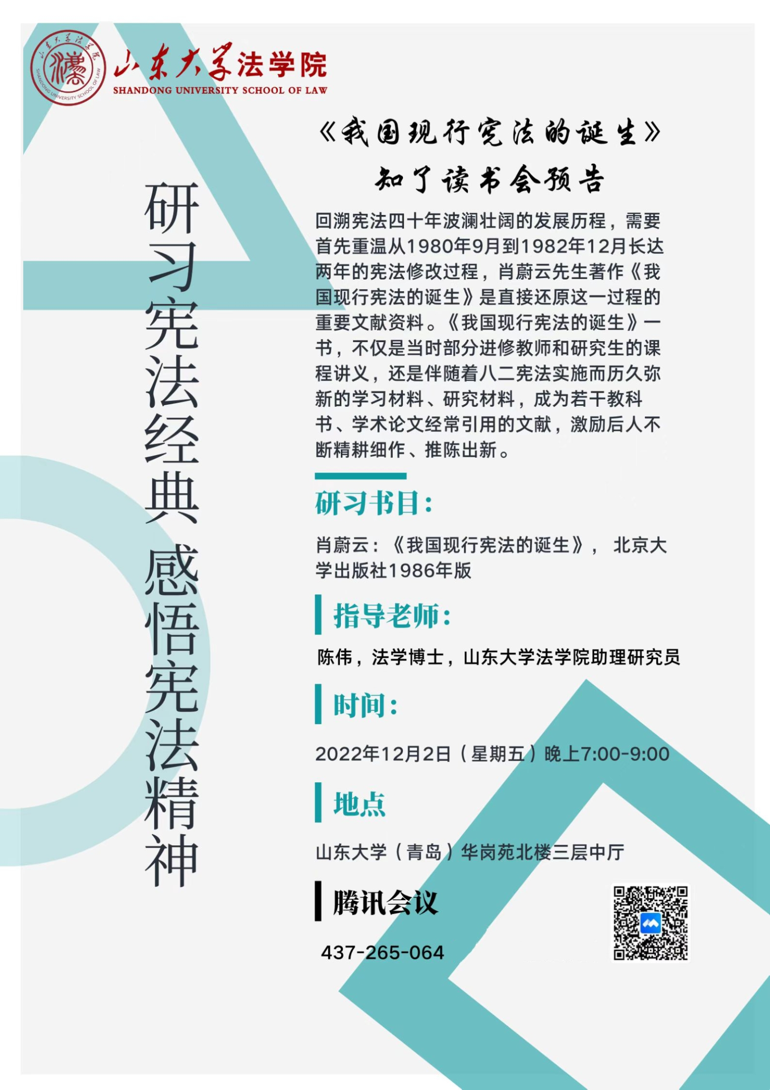今年是八二憲法公布施行四十周年,為了探尋八二憲法從何處來、往何處去,感悟憲法的時代精神、聆聽憲法的“脈搏跳動”,2022年第五期知了讀書會將圍繞肖蔚云先生著作《我國現(xiàn)行憲法的誕生》展開研習。