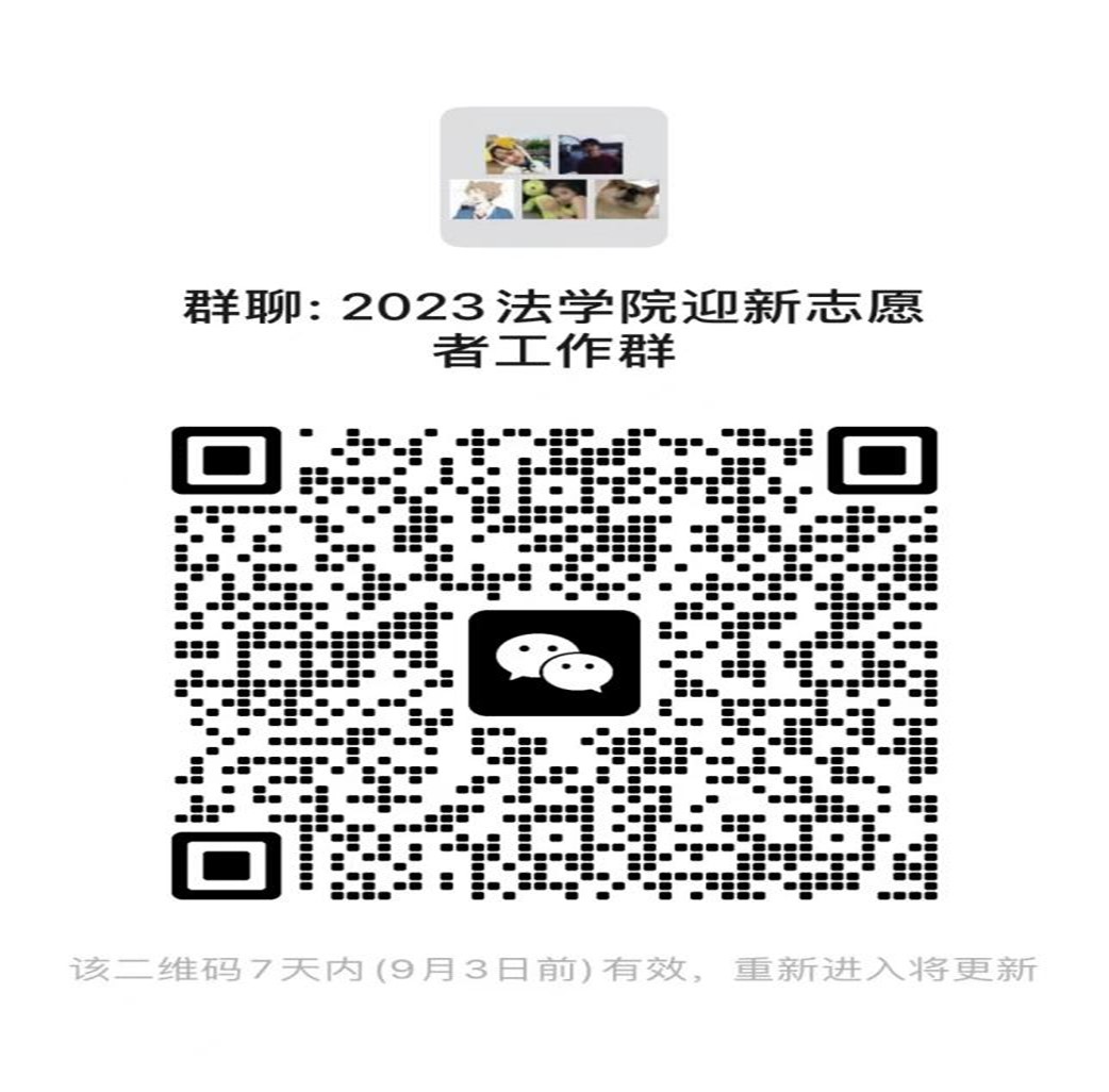 請(qǐng)以上同學(xué)在8月30日前實(shí)名加入“2023法學(xué)院迎新志愿者工作群”,后續(xù)相關(guān)通知將在群內(nèi)發(fā)布,微信群二維碼如圖: