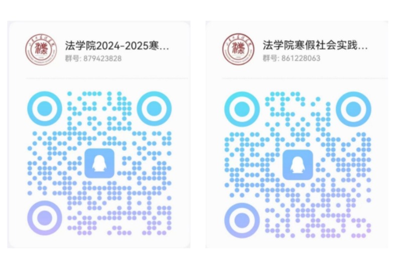 1.請各社會實踐團隊成員于12月30日前加入法學院2024-2025寒假社會實踐交流群(群號:879423828),團隊負責人還需加入隊長群(群號:861228063),后續(xù)立項答辯事宜將于群內(nèi)發(fā)布。請及時關注群內(nèi)通知。