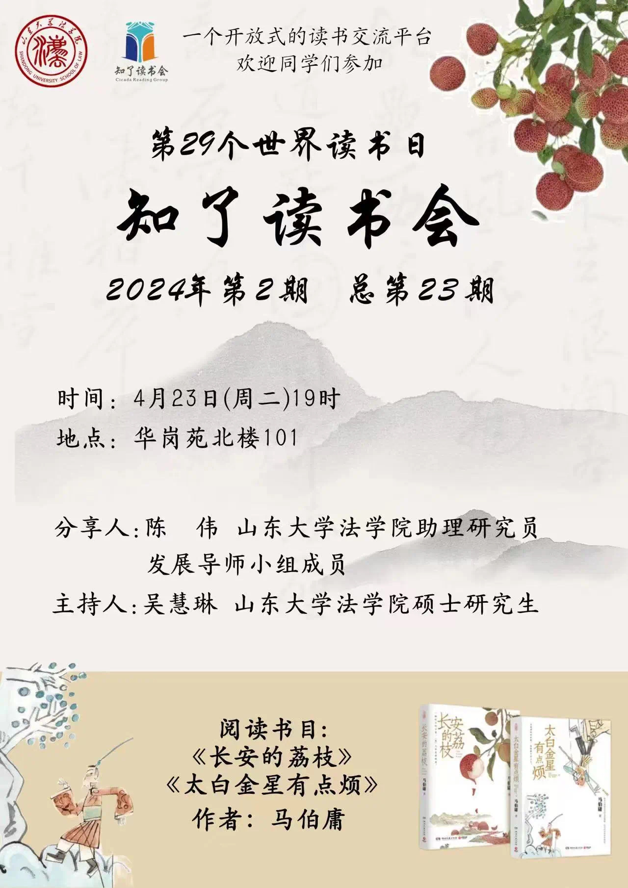 4月23日,在第29屆世界讀書(shū)日之際,知了讀書(shū)會(huì)2024年第2期活動(dòng)在華崗苑舉辦。本期讀書(shū)會(huì)分享人為山東大學(xué)法學(xué)院助理研究員、從文書(shū)院發(fā)展導(dǎo)師陳偉,2022、2023級(jí)發(fā)展導(dǎo)師小組全體成員,本科生輔導(dǎo)員黃憬怡老師、部分研究生參加讀書(shū)會(huì),閱讀書(shū)目為《長(zhǎng)安的荔枝》《太白金星有點(diǎn)煩》。