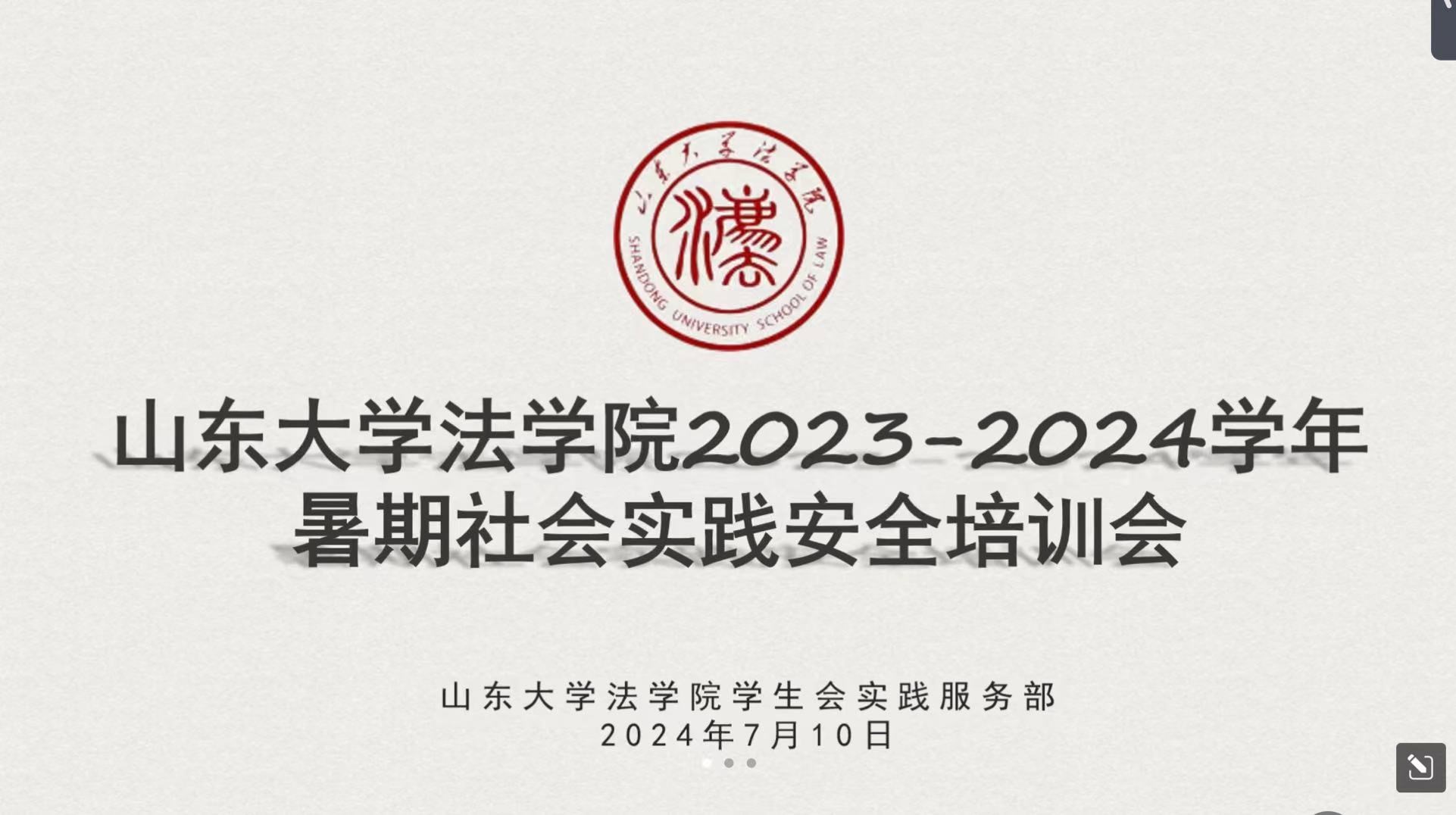 為進(jìn)一步加強(qiáng)同學(xué)們?cè)陂_展社會(huì)實(shí)踐時(shí)的安全防范意識(shí),保障本次暑期社會(huì)實(shí)踐活動(dòng)安全、有序地開展,法學(xué)院2023-2024學(xué)年暑期社會(huì)實(shí)踐安全培訓(xùn)會(huì)于7月10日晚在線上召開,法學(xué)院團(tuán)委書記曲儀老師參加會(huì)議,各實(shí)踐團(tuán)隊(duì)負(fù)責(zé)人到會(huì)學(xué)習(xí)。