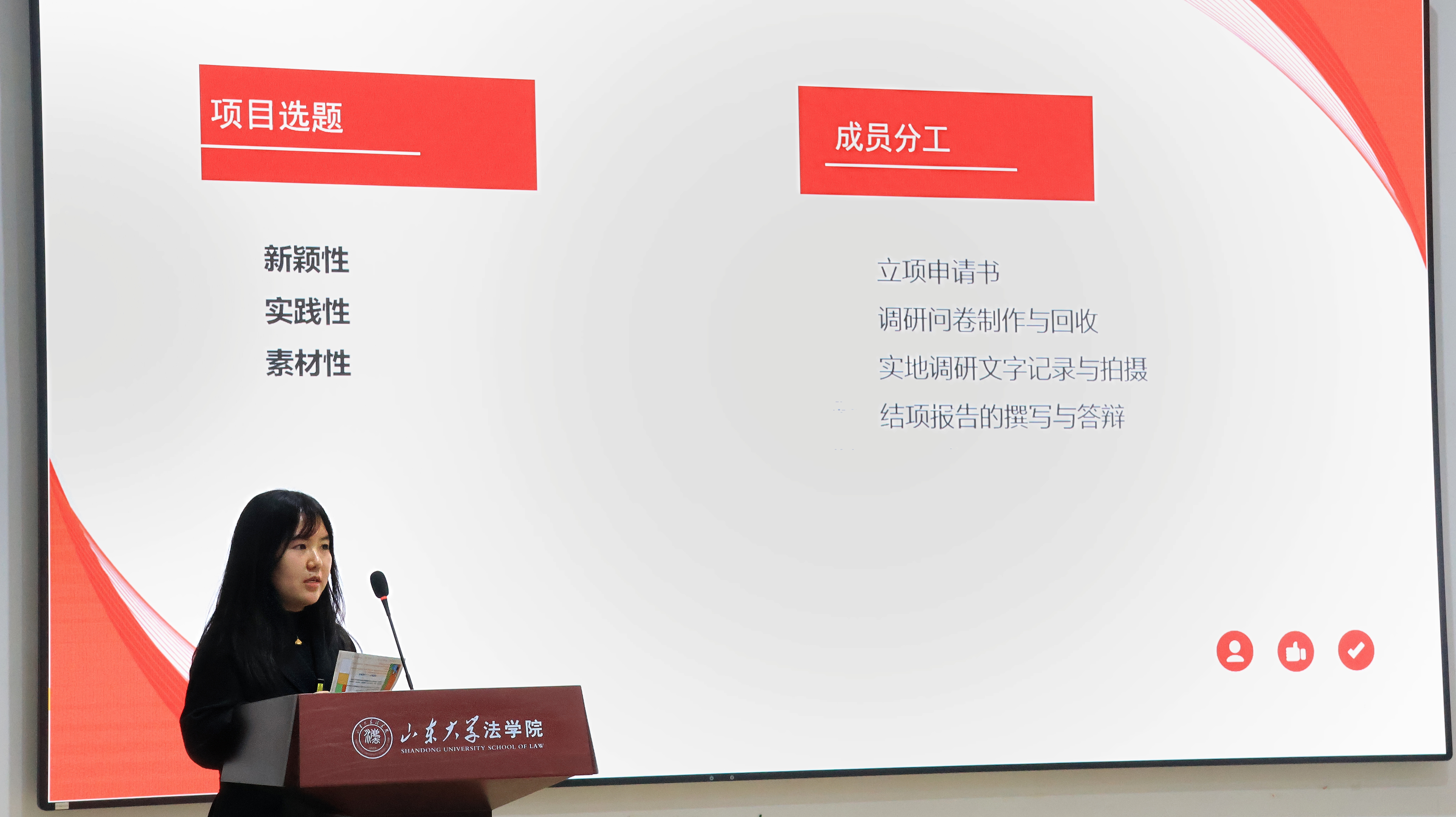 “普法明義”實(shí)踐團(tuán)的鄭澤寧認(rèn)為,項(xiàng)目選題要具有新穎性、實(shí)踐性和素材性,在實(shí)踐調(diào)研中要及時(shí)留下豐富的圖片和文字記錄。此外,她還特別分享了團(tuán)隊(duì)對(duì)于結(jié)題成果總結(jié)撰寫(xiě)的經(jīng)驗(yàn),如做好目錄、注意格式、詳細(xì)腳注等,使在場(chǎng)同學(xué)受益良多。