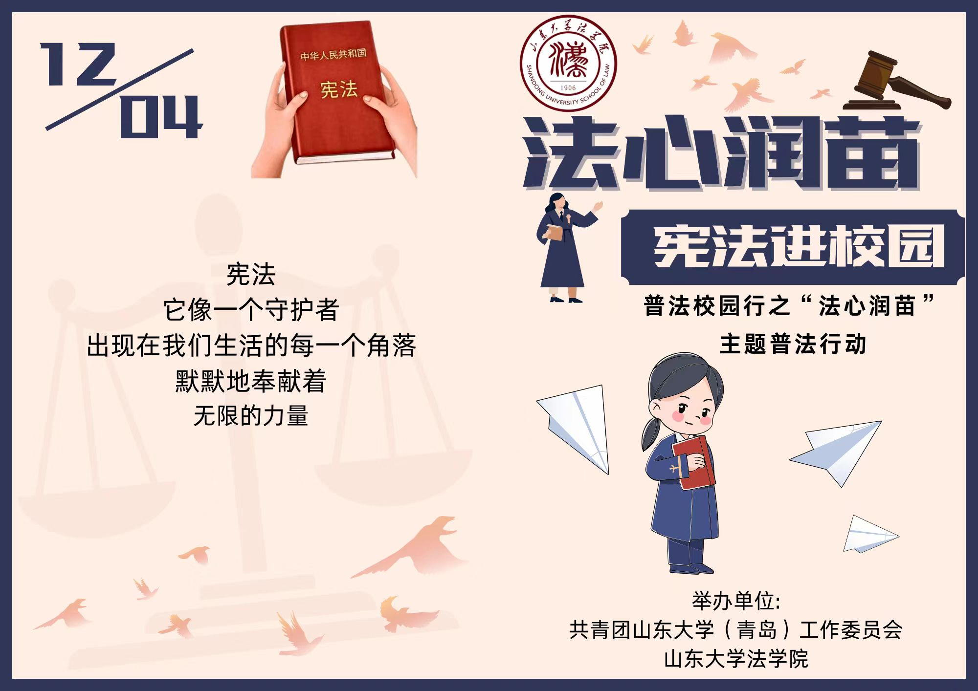今年12月4日是第十一個(gè)國家憲法日,為頌揚(yáng)憲法之精神,增強(qiáng)憲法權(quán)威,同時(shí)培養(yǎng)師生們對(duì)憲法的崇敬、遵從及踐行意識(shí),山東大學(xué)學(xué)生法律援助中心特此發(fā)起憲法拼貼詩創(chuàng)作大賽,誠摯邀請(qǐng)山東大學(xué)青島校區(qū)全體師生踴躍參加。