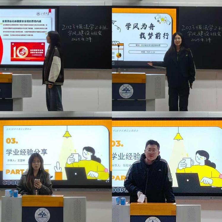 為深化學(xué)風(fēng)建設(shè)實(shí)效,助力學(xué)生成長成才,4月24日晚,法學(xué)院2023級(jí)2班召開“學(xué)風(fēng)為舟,載夢(mèng)前行”主題班會(huì)。班會(huì)設(shè)置安全教育、學(xué)風(fēng)建設(shè)匯報(bào)、學(xué)業(yè)經(jīng)驗(yàn)分享三大板塊,通過理論引導(dǎo)與實(shí)踐指導(dǎo)相結(jié)合的方式,切實(shí)提升班級(jí)學(xué)習(xí)效能。