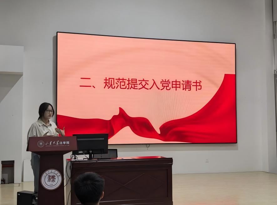 法學(xué)院本科生第一黨支部李承陽同志緊扣《中國共產(chǎn)黨發(fā)展黨員工作細(xì)則》《山東大學(xué)黨員發(fā)展規(guī)程》等規(guī)范文件要求,結(jié)合學(xué)校發(fā)展黨員工作實(shí)際,對(duì)發(fā)展黨員的具體流程進(jìn)行了分步講解。著重闡述了申請(qǐng)入黨、入黨積極分子的確定和培養(yǎng)教育、發(fā)展對(duì)象的確定和考察、預(yù)備黨員的接收以及預(yù)備黨員的教育、考察和轉(zhuǎn)正等關(guān)鍵時(shí)間節(jié)點(diǎn),向新生團(tuán)員青年展示了黨員發(fā)展的完整路線圖與時(shí)間表。