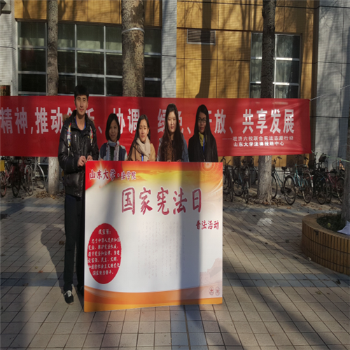 為學(xué)習(xí)與宣傳憲法,推動貫徹落實黨的十八屆四中、五中全會精神,2015年12月4日上午9時至12時,由山東大學(xué)法律援助中心為主舉辦的以“弘揚憲法精神,推動創(chuàng)新、協(xié)調(diào)、綠色、開放、共享發(fā)展”為主題的“12·4”國家憲法日宣傳活動在濟南市六地同時順利舉行。本次活動得到了包括山東省總工會、山東省農(nóng)民工維權(quán)工作站、濟南市總工會、濟南市天橋區(qū)司法局、濟南市歷城區(qū)司法局等在內(nèi)的多家合作單位的持續(xù)關(guān)注與有力支持。