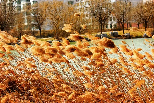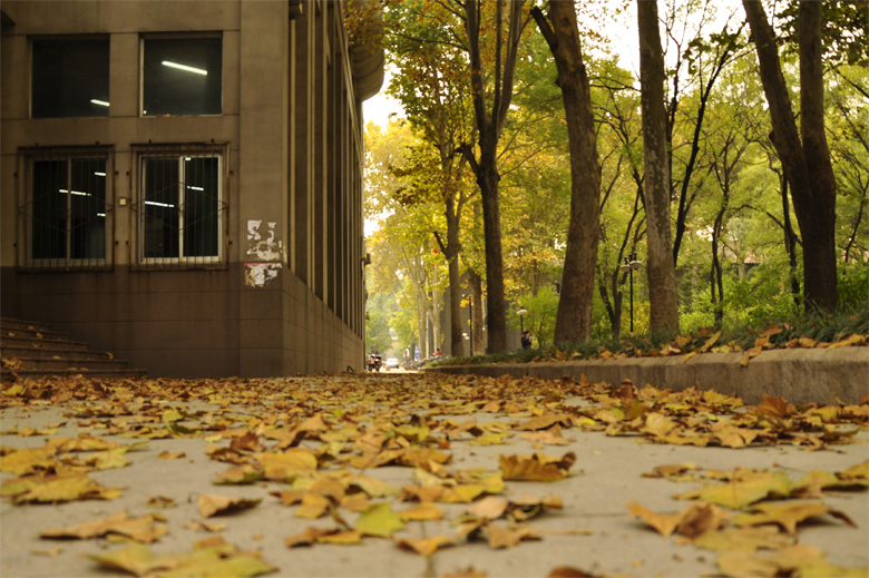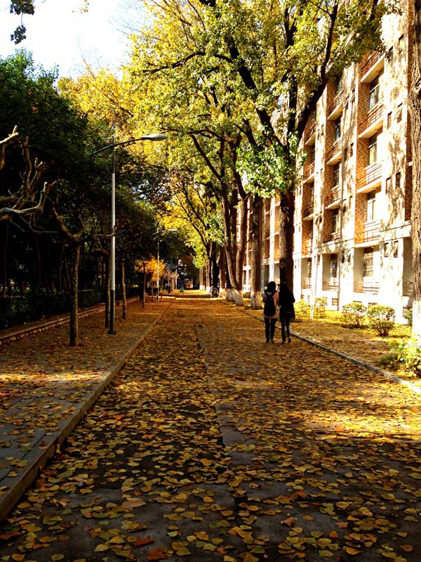 落葉之窗:整個場景在雨后的清陽下顯得格外明亮,而映襯在藍(lán)天中的深綠與依托在大地上的鵝黃形成了鮮明的對比,并且鵝黃的樹葉自然的形成了一條樹葉疊落而成的小路,一直暈黃了它通向的遠(yuǎn)方。在右側(cè),陽光斜射在不高的公寓樓外,伴隨著幾個學(xué)生走過,更加烘托出了陽光的鮮明和此意境的唯美。——欒曉姣,2011級。