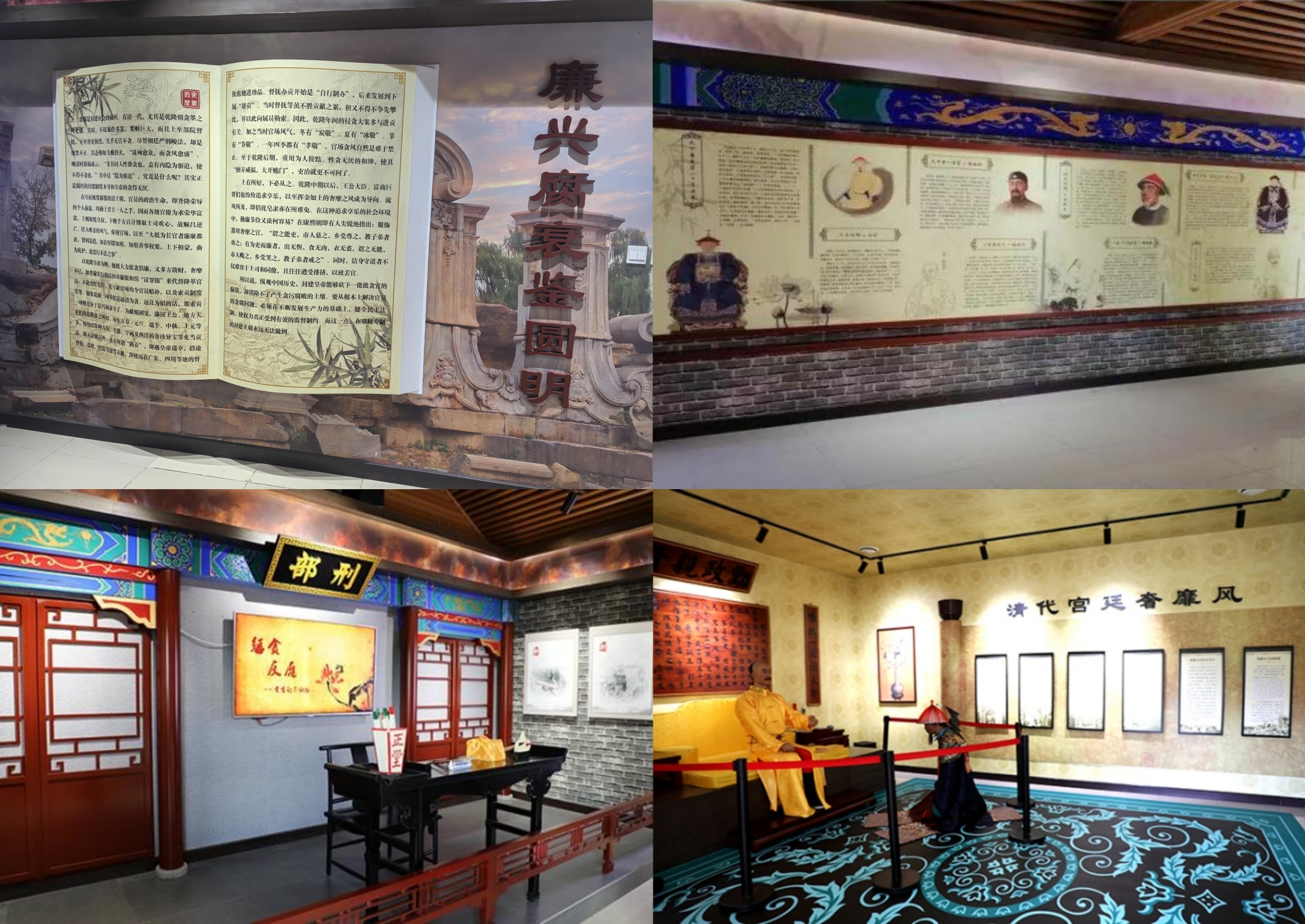 圓明園廉政文化基地以“廉興腐衰鑒圓明”——清代廉政文化展為主題,給廣大干部群眾以歷史啟示和思想警醒。基地共分四個(gè)展廳。一號(hào)廳“澄心堂”,主要展示清代歷史概述和廉政思想文化,集中體現(xiàn)了廉興腐衰的歷史進(jìn)程。二號(hào)廳“師善堂”,主要展示三山五園的廉政文化內(nèi)涵及清代帝王在三山五園的勤政廉政故事等。三號(hào)廳“慎德堂”,主要展示皇帝勤政和奢靡的正反兩方面對比。四號(hào)廳“益思堂”,主要展示清代貪腐事件、貪腐官員,突出今人在歷史面前的反思等。