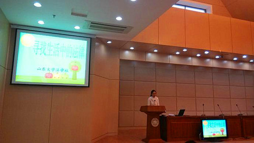 接下來,志愿者帶領(lǐng)同學(xué)們來到法新樓三樓報告大廳,并由法學(xué)院12級王昭華代表法學(xué)社向同學(xué)們講解法律知識。宣講過程中,主持人積極地和同學(xué)們互動,同學(xué)們的思維十分活躍,也都踴躍地回答問題。會場氣氛輕松活潑,讓在場的每一位志愿者和家長都感受到了“孩子”這個群體的朝氣與活力。并且,同學(xué)們一起觀看了山大法學(xué)院各級學(xué)長學(xué)姐精心制作的宣傳視頻。宣傳片中濃縮了大學(xué)生活的剪影,記錄了學(xué)長學(xué)姐們的成長故事,訴說了大學(xué)生蛻變的酸甜苦辣。
