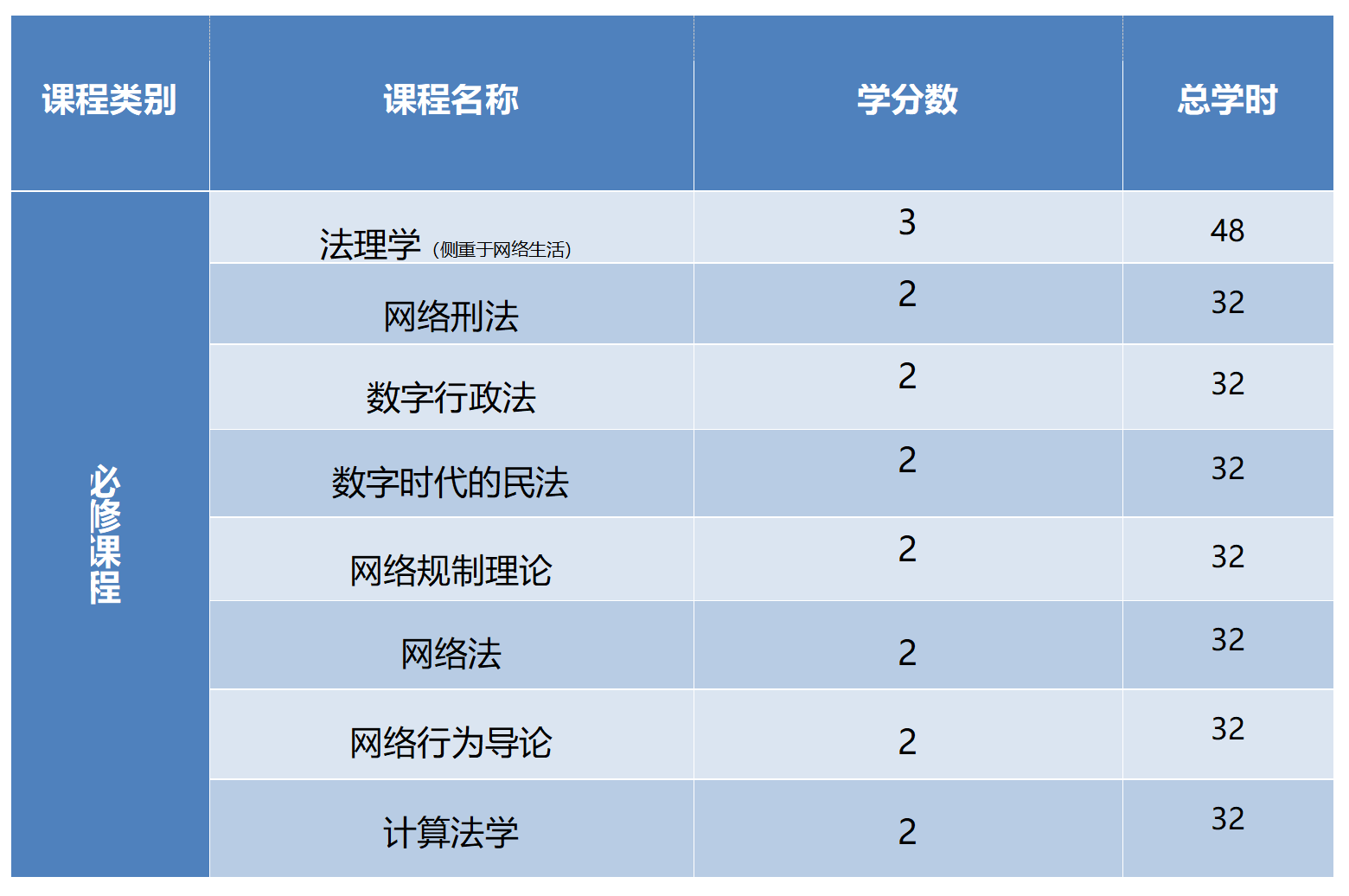 微專業(yè)共計(jì)17學(xué)分,其中法學(xué)基礎(chǔ)課程9學(xué)分,包括法理學(xué)(側(cè)重于網(wǎng)絡(luò)生活)、網(wǎng)絡(luò)刑法、數(shù)字時(shí)代的民法、數(shù)字行政法;網(wǎng)絡(luò)安全類課程8學(xué)分,包括網(wǎng)絡(luò)規(guī)制理論、網(wǎng)絡(luò)法、網(wǎng)絡(luò)行為導(dǎo)論、計(jì)算法學(xué)。