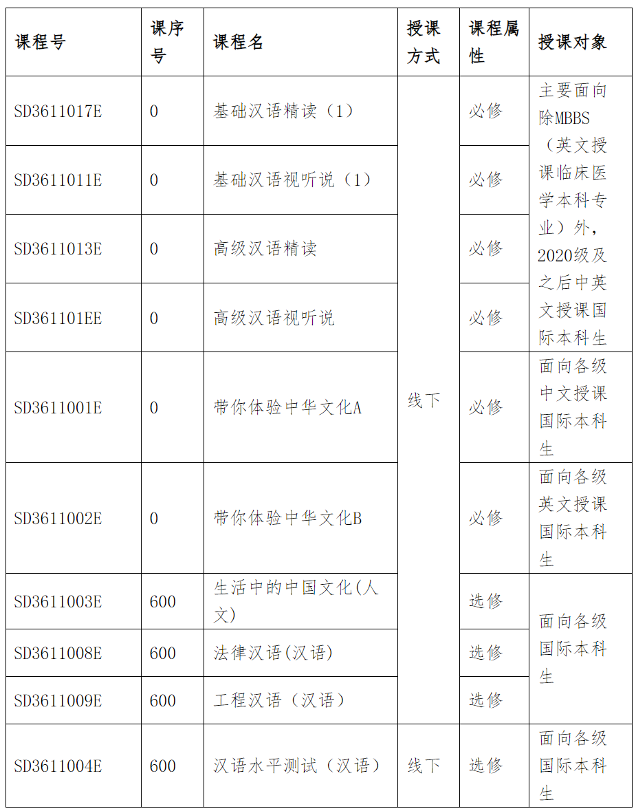 根據(jù)山東大學(xué)國際化課程建設(shè)方案和國際本科人才培養(yǎng)方案的指導(dǎo)意見,2024年秋季學(xué)期面向國際本科生開設(shè)以下通識課程,請各學(xué)院做好國際本科生選課指導(dǎo),如有疑問可聯(lián)系開課學(xué)院教務(wù)秘書于老師:88363406。