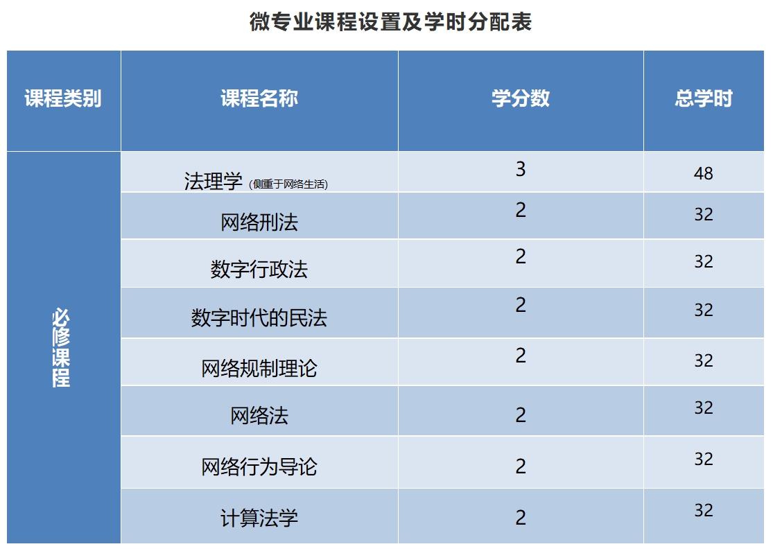 微專業(yè)共計17學(xué)分,課程設(shè)置注重法學(xué)與網(wǎng)絡(luò)安全的交叉融合,核心課程主要包括:法理學(xué)(側(cè)重于網(wǎng)絡(luò)生活)、網(wǎng)絡(luò)刑法、數(shù)字時代的民法、數(shù)字行政法、網(wǎng)絡(luò)規(guī)制理論、網(wǎng)絡(luò)法、網(wǎng)絡(luò)行為導(dǎo)論、計算法學(xué)。