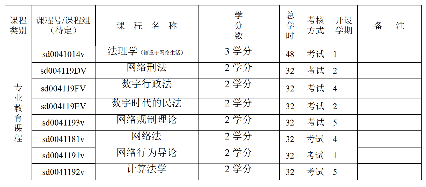 法理學(側重于網絡生活)、網絡刑法、數字行政法、數字時代的民法、網絡規(guī)制理論、網絡法、網絡空間行為導論、計算法學。