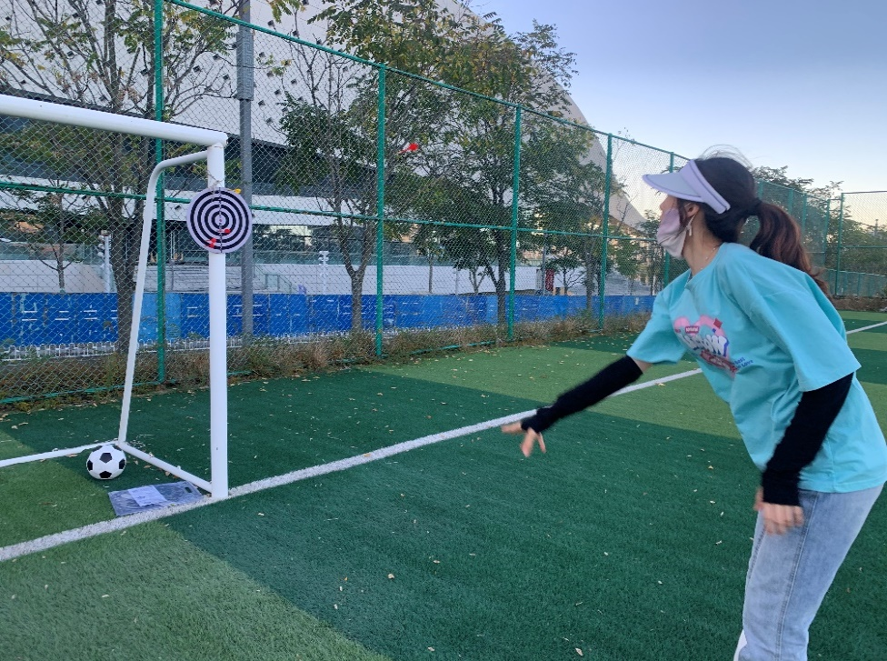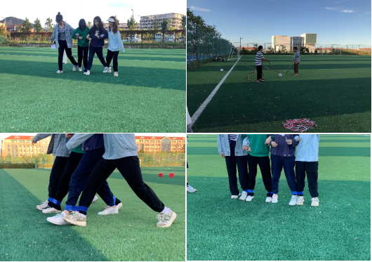 擲飛鏢比賽中, 參賽選手們嚴(yán)格聽從裁判員的安排,在規(guī)定的黃線外筆直站定, 參賽的選手屏氣凝神,對準(zhǔn)靶心,手腕一轉(zhuǎn),飛鏢猶如離弦之箭飛了出去,“握鏢——瞄準(zhǔn)——投標(biāo)”三個動作一氣呵成。在聲聲歡呼中,同學(xué)們一次次超越自我,享受著戶外運(yùn)動的快樂。四人五足游戲則體現(xiàn)出同學(xué)們的集體凝聚力,