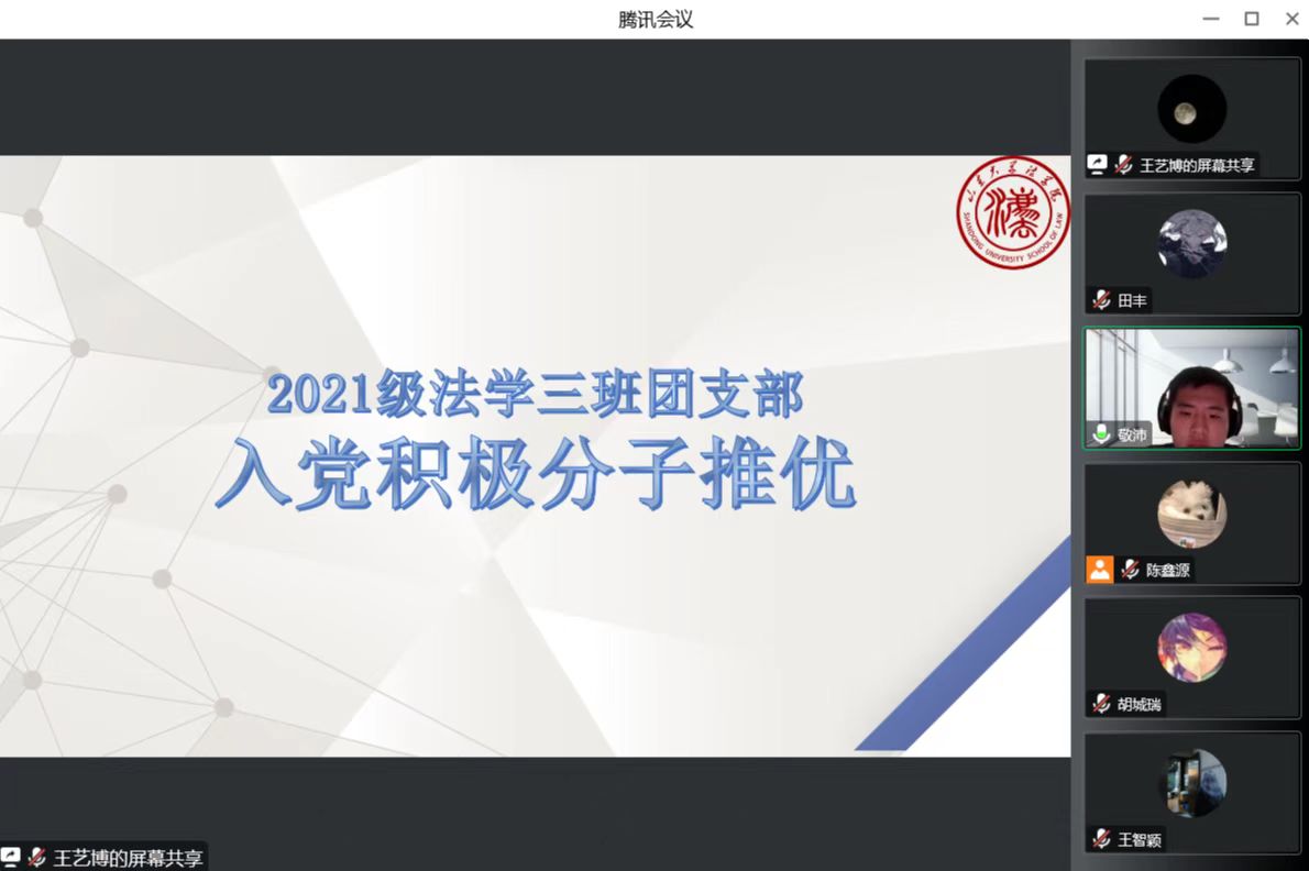 為進(jìn)一步做好發(fā)展黨員工作,切實(shí)加強(qiáng)入黨積極分子隊(duì)伍建設(shè),按照山東大學(xué)法學(xué)院本科生黨支部關(guān)于進(jìn)一步做好入黨積極分子推薦工作的意見(jiàn),法學(xué)院2021級(jí)法學(xué)三班團(tuán)支部于2022年9月19日召開(kāi)入黨積極分子推優(yōu)大會(huì)。本次大會(huì)由團(tuán)支書(shū)陳鑫源主持,輔導(dǎo)員付聰參會(huì)。鑒于當(dāng)前疫情形式,大會(huì)以線(xiàn)上形式開(kāi)展。