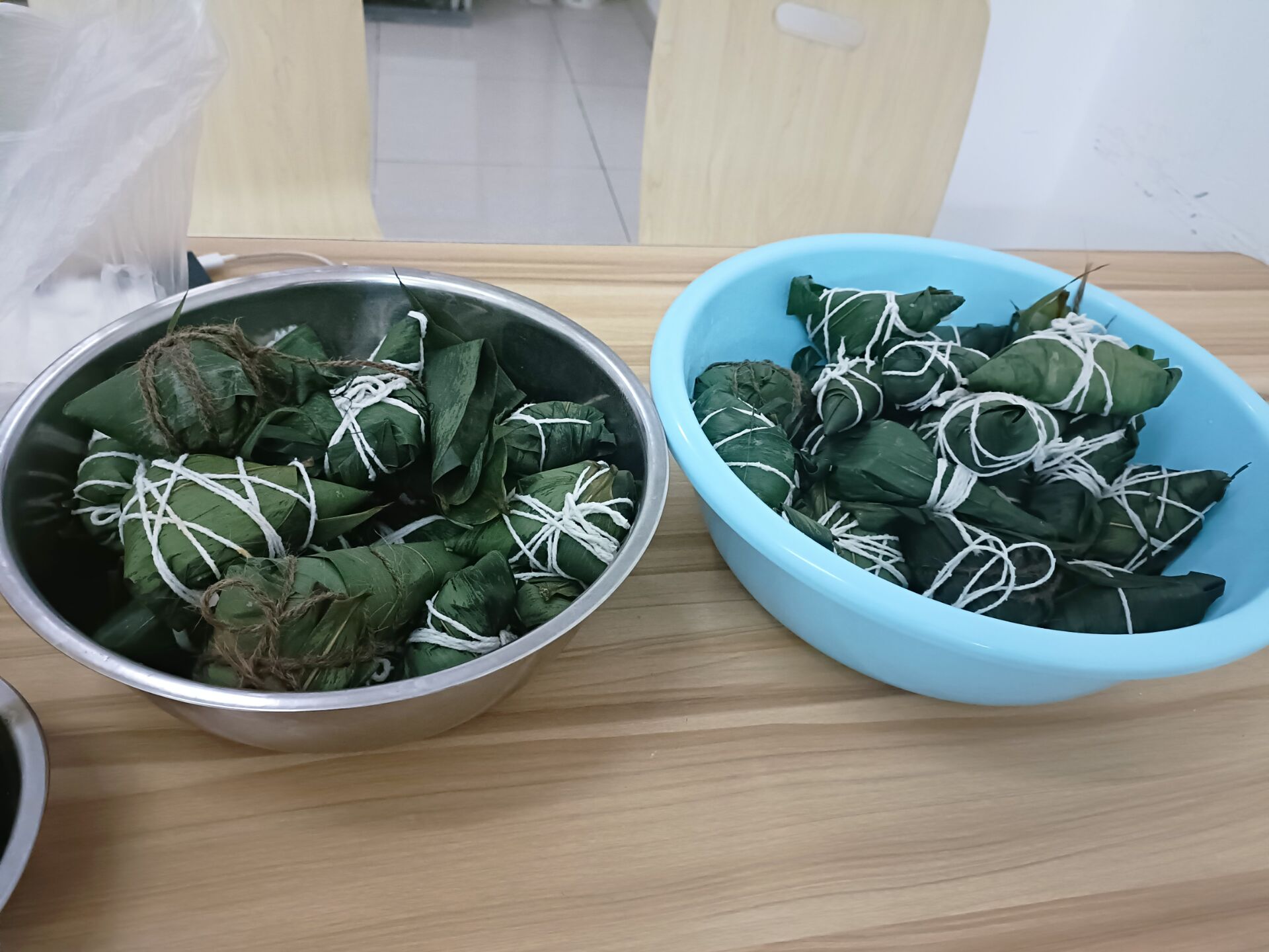 包完粽子后,由班委送往食堂,與聯(lián)系好的工作人員對接工作,將粽子煮熟。最后同學們自由挑選煮熟的粽子,“品嘗”一份不一樣的端午感受。王藝博同學說到:“這次活動大家可以自由地選擇包粽子的餡料,diy屬于自己的粽子形狀,還可以和同學一起分享快樂,整個過程非常有意義。”