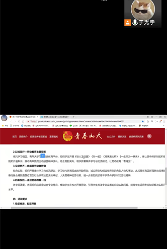 做好勞動(dòng)教育,首先要做到對(duì)文件核心精神能夠深刻理解和貫徹落實(shí)。團(tuán)支書于光宇同學(xué)基于《關(guān)于全面加強(qiáng)新時(shí)代大中小學(xué)勞動(dòng)教育的實(shí)施意見》(以下簡(jiǎn)稱《意見》)以線上會(huì)議的形式向全體團(tuán)員深入淺出地闡述了新時(shí)代勞動(dòng)教育的核心精神與內(nèi)容要旨,并結(jié)合《中共山東大學(xué)委員會(huì)關(guān)于全面加強(qiáng)新時(shí)代學(xué)生勞動(dòng)教育的行動(dòng)方案》等本校文件,對(duì)未來勞動(dòng)實(shí)踐進(jìn)行指導(dǎo)和規(guī)劃。在會(huì)議中,各位同學(xué)就自己對(duì)于《意見》精神內(nèi)涵的理解各抒己見,全面體現(xiàn)了各位同學(xué)對(duì)于勞動(dòng)教育重要性的認(rèn)識(shí)與看法。