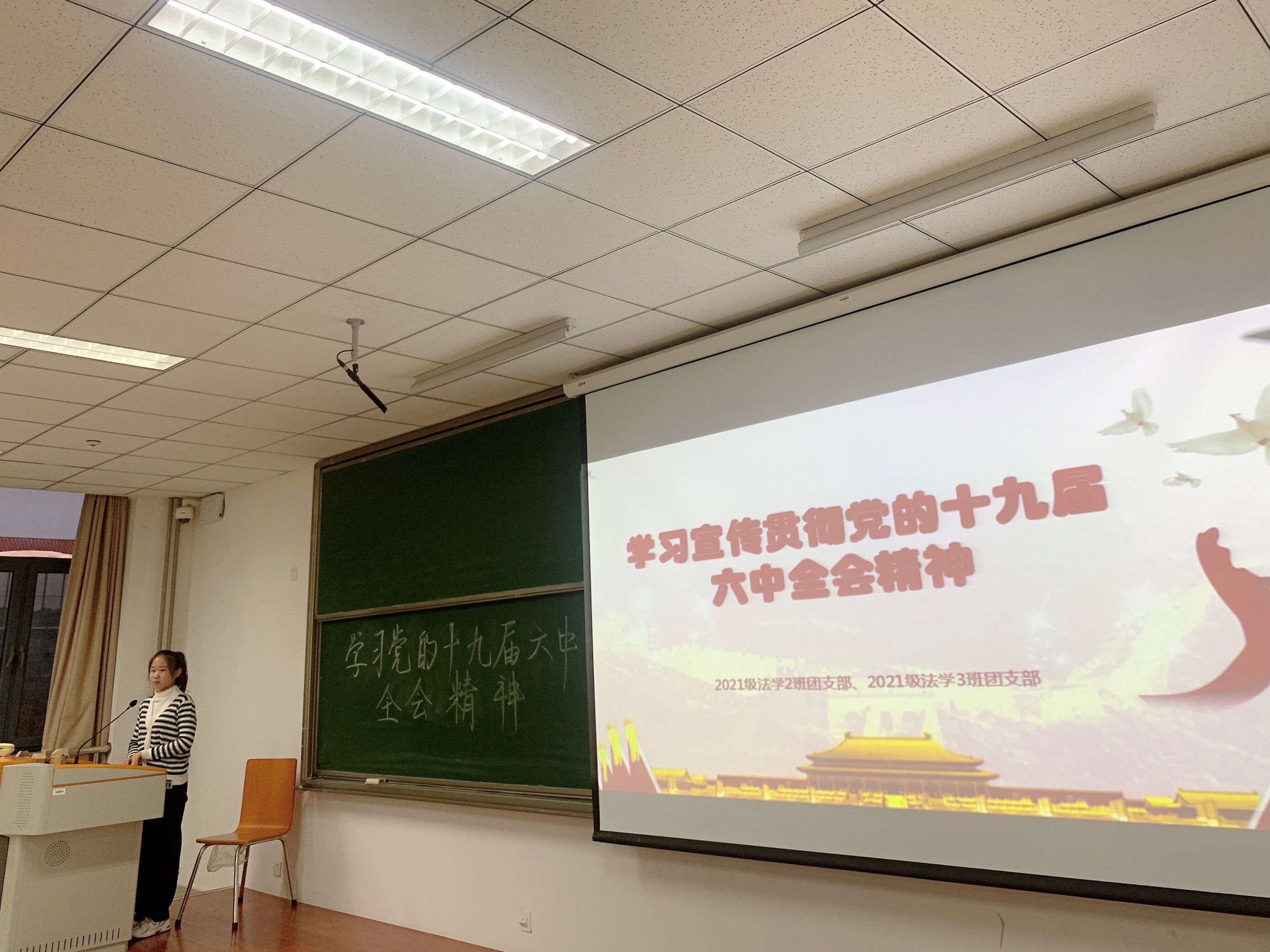 為使同學們更好地了解黨的百年奮斗的重大成就和歷史經(jīng)驗,激勵同學們在祖國的萬里長空放飛青春夢想,在黨的十九屆六中全會閉幕之際,2021級法學二班團支部和2021級法學三班團支部于11月18日開展“學習黨的十九屆六中全會精神”主題團日活動。本次活動由2021級三班團支書陳鑫源主持,2021級二班和三班朋輩班主任劉東敘和羅智晉參加。