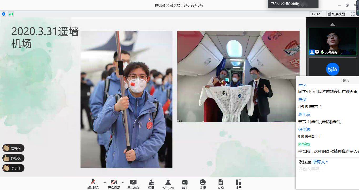 團(tuán)課伊始,山東大學(xué)第二醫(yī)院援鄂醫(yī)療隊(duì)成員常超向同學(xué)們講述了自己的戰(zhàn)疫故事,分享了援鄂抗疫過(guò)程中的心得體會(huì)。作為一名95后的她,看到前輩們?cè)诿鎸?duì)猖獗的新冠肺炎疫情時(shí)紛紛義無(wú)反顧放棄春季假期、主動(dòng)請(qǐng)纓前往支援,她備受鼓舞,也毫不猶豫地提交申請(qǐng)奔向湖北一線(xiàn)。常超母親曾對(duì)她說(shuō)過(guò):“在國(guó)家危難時(shí)貢獻(xiàn)一份力量,保護(hù)更多人的同時(shí)也要保護(hù)好自己。”這句話(huà)令她終身難忘而又倍感自豪。她提到,盡管在援鄂初期有很多困難需要大家去克服,但大家始終心懷希望,全國(guó)人民的掛念、患者的信任和來(lái)自家鄉(xiāng)的大饅頭都給予了她和她的同事們精神上的鼓舞與支持,使他們?cè)谂c病毒的戰(zhàn)斗中愈戰(zhàn)愈勇。常超這段關(guān)于成長(zhǎng)與責(zé)任的抗疫故事讓大家動(dòng)容,每一位團(tuán)員青年都在為常超的抗疫故事點(diǎn)贊,為新時(shí)代青年點(diǎn)贊!